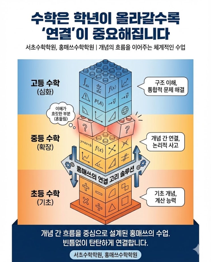 안녕하세요. 본질에 충실하면서도, 철저한 체계 아래 실력을 길러주는 홍매쓰수학학원 서초점입니다. “초등 때는 잘했는데, 중학교 올라가더니 갑자기 힘들어졌어요.” “학년이 올라갈수록 수학이 버거워요.” 학부모 상담에서 가장 자주 나오는 말입니다. 하지만 이 변화는 아이가 갑자기 못해져서가 아닙니다. 수학의 구조 자체가 달라지기 때문입니다. 수학은 학년이 올라갈수록 점점 더 복잡해지고, 이전 개념 위에 새로운 내용을 쌓아 올리는 ‘누적형 과목’으로 바뀝니다. 수학은 학년이 올라갈수록 ‘연결’이 중요해집니다 서초수학학원, 홍매쓰수학학원에서 학생들을 지도하다 보면 학년이 올라갈수록 어려움을 느끼는 아이들의 공통....... <img src="https://blogthumb.pstatic.net/MjAyNjAyMjNfMTI1/MDAxNzcxODI5MjY1MzMy.PFiB7C7lg6Ve5e8Xo5gAJaRm1Q62SlMqLtl5GjUoS7Ag.gWLLwJOxYFYcccB9UtzrI-L-3bDENVRlB5VEnncbymQg.JPEG/unnamed.jpg?type=s3" />