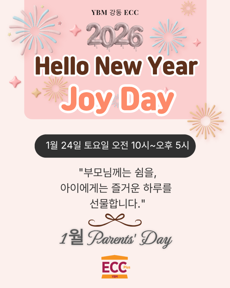 [강동ECC] 1월 Parents' Day 신청 안내 안녕하세요 강동ECC 입니다.^^ 1월 24일 토요일에 진행되는 Ivy Kids(오전 유치부)와 오후 유아회화반, Ivy Kids 가등록자 친구들을 위한 Parents' Day를 안내드립니다. 아래 첨부 드린 내용 확인하셔서 많은 참여 부탁드립니다. ▶ 1월 페어런츠 데이의 주제는 " Hello New Year! Joy Day " 입니다. ▶ 신청대상 : Ivy Kids(오전 유치부)와 오후 유아회화반 친구들, Ivy Kids(오전 유치부 가등록생) (인원이 많을 경우 제한 될 수 있으니 양해부탁드립니다.) - 가등록생 중 부모님과 분리가 어려운 친구들은 행사 참석이 어려우니 양해부탁드립니다.^^ ▶ 운영시간 : 1/24(토) 오전 1....... <img src="https://blogthumb.pstatic.net/MjAyNjAxMTlfMjUg/MDAxNzY4NzkwNTg2NDg5.hUC38XWEr4HtP9MPuWGdkRLceIHq8gI5I7ELgYpTVnkg.GSZKR9NmD8S1-WMJsGl8RgHV9b2dCAVBU-s0zE02d14g.PNG/2.png?type=s3" />