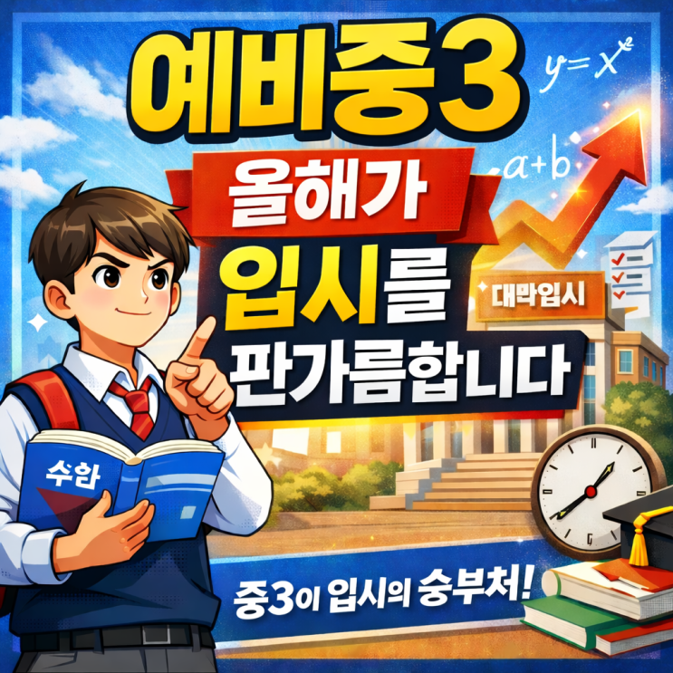아이가 이제 중3이 된다고 하면 "아직 초등학교 졸업한 지 얼마 안 된 것 같은데..." "벌써 고등학교가 눈앞이라니, 시간이 이렇게 빠르구나…" 이런 생각이 드실 겁니다. 그런데 지금의 입시 환경에서는 올해 중3 시기를 어떻게 보내느냐에 따라 입시의 방향이 결정된다고 해도 과언이 아닙니다. 왜 중3이 입시의 분기점이 될까요? 예비 중3 시기는 단순한 한 학년의 시작이 아닙니다. 대입을 위한 본격적인 준비의 출발점이자, 앞으로의 입시 성패를 가늠하는 아주 중요한 시기입니다. 현재 입시의 흐름은 명확합니다. ✔️ 수능 중심 → 학생부종합전형(학종) 중심 ✔️ 내신, 학업 태도, 학업의 깊이가 더욱 중요해....... <img src="https://blogthumb.pstatic.net/MjAyNjAxMjdfMTAx/MDAxNzY5NDg1MzUxNzky.CnMOja8LjRtrq9wYDf-5L5ItRHfb7tIqv29hCEpCA8Qg.5ewQLyncVq5eJh6Q-KUGCWEvBJaDVl8GQt7xssj3KR4g.PNG/ChatGPT_Image_2026%B3%E2_1%BF%F9_27%C0%CF_%BF%C0%C8%C4_12_42_08.png?type=s3" />