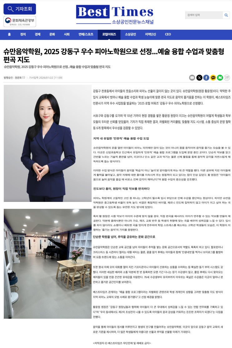 슈만음악학원이 2025년 강동구 우수 피아노학원으로 선정되었습니다! 학원 벽면에 부착할 현판도 도착했습니다 ! 2025년 하반기 콩쿨 입상내역입니다! http://www.instagram.com/schumann8896 교육상담 : 02)483-8896 010-2816-8896 #신암초등학교피아노학원 #신암초피아노 #강동구음악학원 #강동구피아노 #슈만음악학원 #슈만피아노 #강동초피아노 #강동초등학교음악학원 #선사초피아노 #선사초등학교음악학원 #천호동피아노 #선사현대아파트피아노 #선사현대아파트 #강변그대가 #힐스테이트강동리버뷰 #힐스테이트암사 <img src="https://blogthumb.pstatic.net/MjAyNjAxMjdfNTEg/MDAxNzY5NTEzMTg1MDcw.w6A3wXlOltMat-zgeGzsYlLsOaFVTaZlp6nFu4Lzbncg.RXgCkoXhpJ0uM1lGm7wKzS6VA3Cpb8_DA73GWdo2BOUg.JPEG/%BA%A3%BD%BA%C6%AE%C5%B8%C0%D3%C1%EE%B1%E2%BB%E7.jpg?type=s3" />