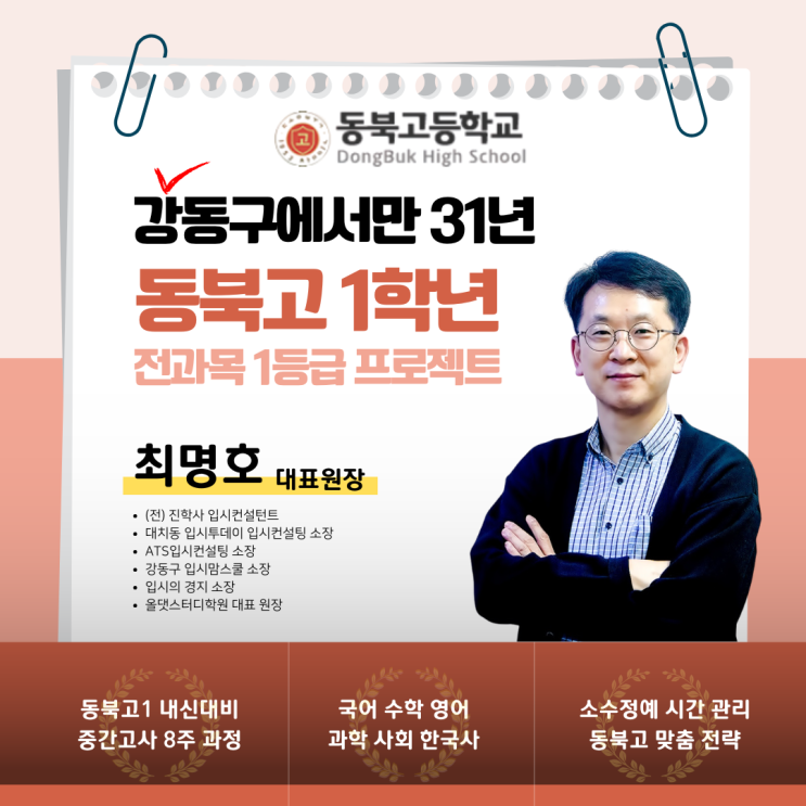 동북고1 과목별 출제경향 및 대비전략 안녕하십니까, 올댓스터디학원입니다. 동북고등학교 입학을 앞두고, 강동구의 높은 내신 장벽 소문에 걱정이 많으실 학부모님과 학생들을 위해 '31년 강동구 고교 외길' 학원장으로서 2026학년도 1학년 1학기 중간고사 1등급 필승 전략을 전수합니다. 올해는 고교학점제 시행 2년차로, 내신 변별력이 그 어느 때보다 정교해진 시기입니다. 동북고의 출제 '로직'을 모르면 1등급은 멀어집니다. 31년의 데이터로 증명하는 올댓스터디의 전략을 확인하십시오. [동북고 1학년] "첫 시험의 기세가 고교 3년을 결정합니다" 올댓스터디가 제안하는 6과목 올라운드 내신 전략 동북고....... <img src="https://blogthumb.pstatic.net/MjAyNjAyMjVfMjQw/MDAxNzcxOTk0MDIwODg5.gXTw0JmDE6QIbauBr33a9ktjIUSbIxFRy9uyzZU85f8g.tYCrH5K-980veqWiz6B-pyWV3Dy-5DUlX3GEBbHBNT4g.PNG/1.png?type=s3" />