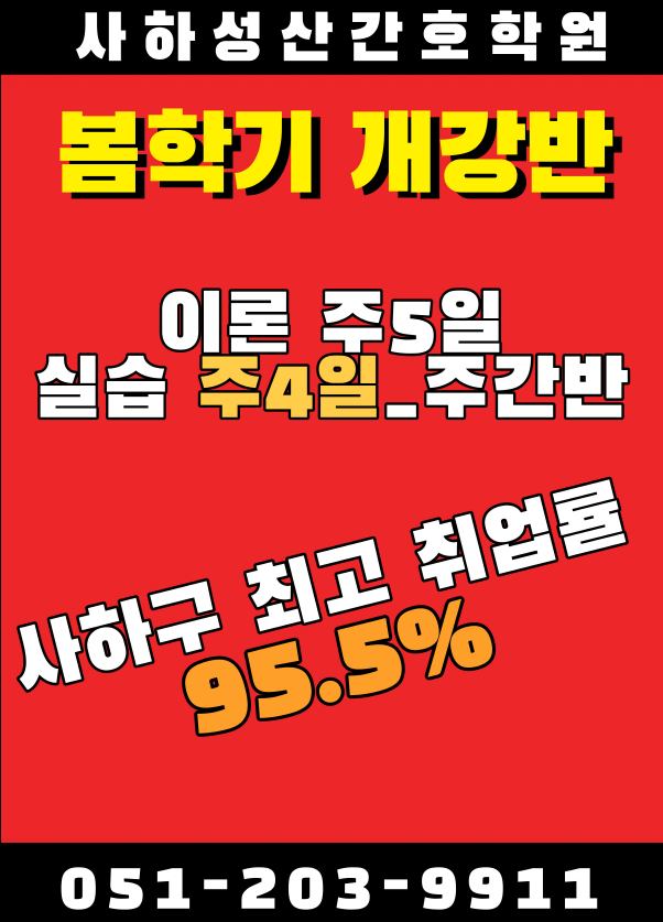 사하성산 간호학원에서 이론 주5일, 실습 주 4일 수업반을 모집합니다. 사하구 취업률 95% 1위 학원 간호조무사 입학부터 취업까지 전 과정을 함께 합니다. 괴정역에서 도보 1분거리!!!! 선착순 30명 입학 모집 중입니다 서둘러 주세요!! 서면성산간호학원, 남포성산간호학원, 사하성산간호학원, 성산요양사보육교육원 등 많은 교육기관을 운영하고 있으며, 탄탄한 실력으로 학생을 모십니다. 주간, 야간 수업반 모집으로 문의주세요. ------------------------------------------------------★----------------- 부산1세대간호학원(25년전통) 30년 이상 현장경력 간호사원장 직접운영으로 안정된 교육환경 -무상지원 : 교재6권, 문제집, 유니폼....... <img src="https://blogthumb.pstatic.net/MjAyNjAyMjVfNzgg/MDAxNzcyMDA0MzEzMzAw.f4HYsFnBsOJs3oiLvbtehZ-ipU-Su0iljj8HDYZLbCgg.lsOSpwbORkRCX_S8PxE76tCo7uGFCRdcWsX2bHz62E0g.PNG/image.png?type=s3" />