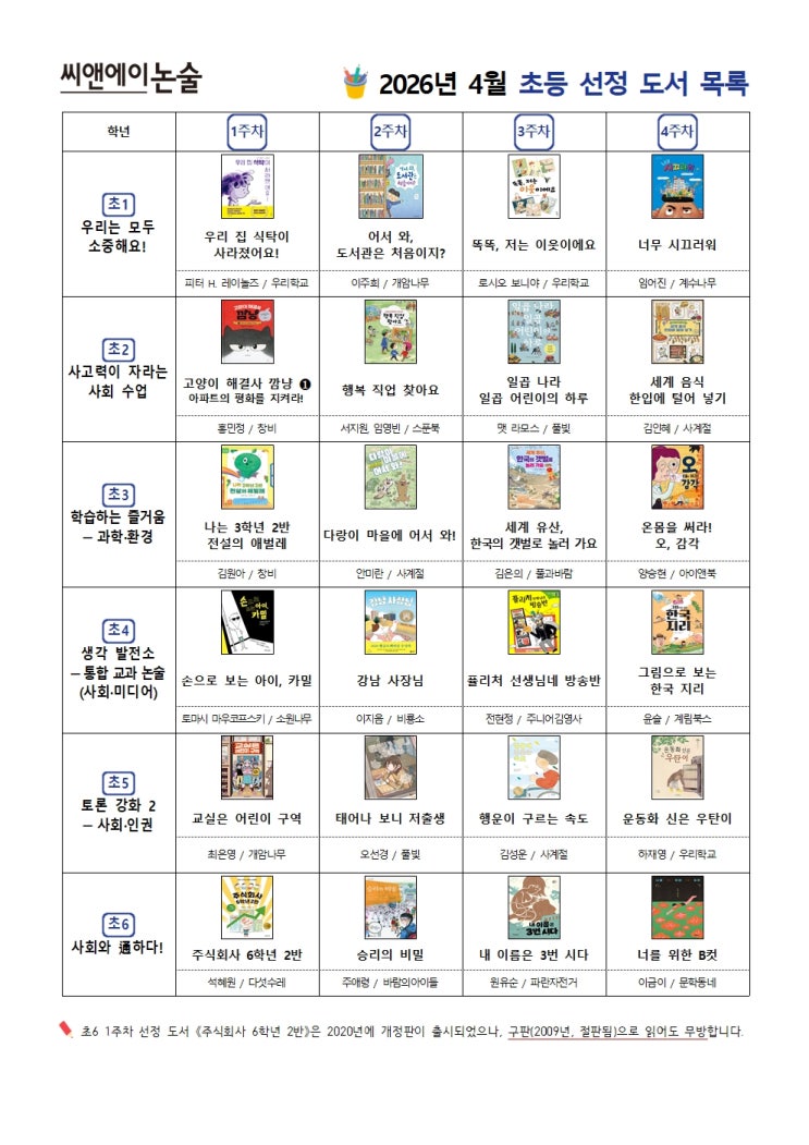 안녕하세요, 씨앤에이 논술입니다. 4월 선정 도서 안내드립니다. 대치동 씨앤에이와 진도가 다를 수 있습니다. 문의사항은 학원으로 연락바랍니다. ☎️ 053) 755 0054 ☎️ 053) 755 3773 #씨앤에이논술 #씨앤에이논술대구 #토론 #논술 #수성구국어학원 #수성구논술학원 #수성구독서논술학원 #수성구씨앤에이논술 #대구논술학원 #범어동국어학원 #범어동논술학원 #범어동독서논술학원 #범어동중등내신 #범어동고등내신 #범어동수능국어 #범어동씨앤에이논술 #수성구초등독서논술학원 #수성구초등독서학원 #범어동독서논술 #범어동초등국어독서 #씨앤에이논술 #씨앤에이논술초등글쓰기 #초등부독서 #초등부논술 #초등부선정도서 #초등추천도서 #대....... <img src="https://blogthumb.pstatic.net/MjAyNjAzMTJfMTU3/MDAxNzczMzE1MTkzMDU5.QsNcWoAgquuJRP1up9yMseg4BCeil55VJ1CqGHbfcWsg.jodCGC5znAl2UXVhKYoZUFMm0Q6lsfaf_dCZflb2XCkg.JPEG/2026_4%BF%F9_4%C1%D6%28%C7%A5%C1%F6_%C3%DF%B0%A1%29001.jpg?type=s3" />