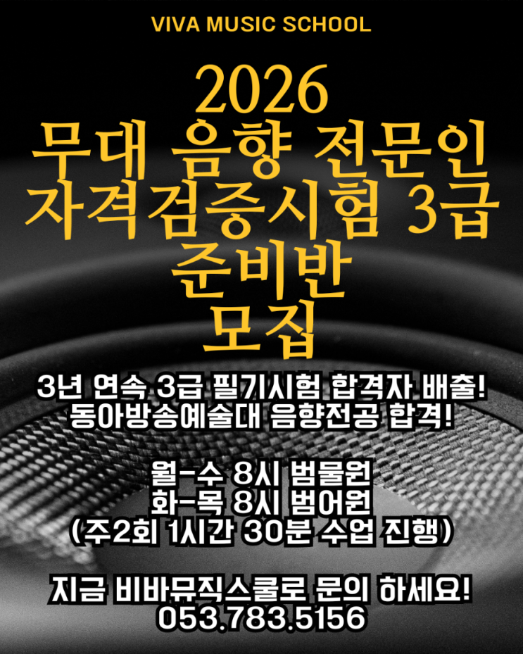 매년 음향기사 3급 필기 합격생을 배출하고 있는 비바뮤직스쿨 음향 자격증 반! 올해도 드디어 시작합니다 4개월간 주2회 1시간30분 수업으로 무대 음향 전문인 3급 시험 합격의 기쁨을 누리세요 고등학교 졸업예정자 부터 누구나 가능! 매년 합격을 책임지는 박경민 황일영 선생님의 전문적이고 확실한 강의! 지금 바로 비바뮤직스쿨에서 시작하세요! 2월첫주 시작예정이니 지금 바로 문의하세요! 음향도 역시 비바뮤직스쿨! 문의 053.783.5156 #음향자격증학원 #비바뮤직스쿨 #음향엔지니어 <img src="https://blogthumb.pstatic.net/MjAyNjAxMjBfOTEg/MDAxNzY4ODcwODE1MTQ3.4QECsnhgx3RXzVUdoihDRzcBaKedLKf_GN90ZIupu_Eg.4waTLv231EUu5xaqhOY5XbsAscatH1JmT2FLUx3-XLgg.PNG/900%A3%DF1768816449916.png?type=s3" />