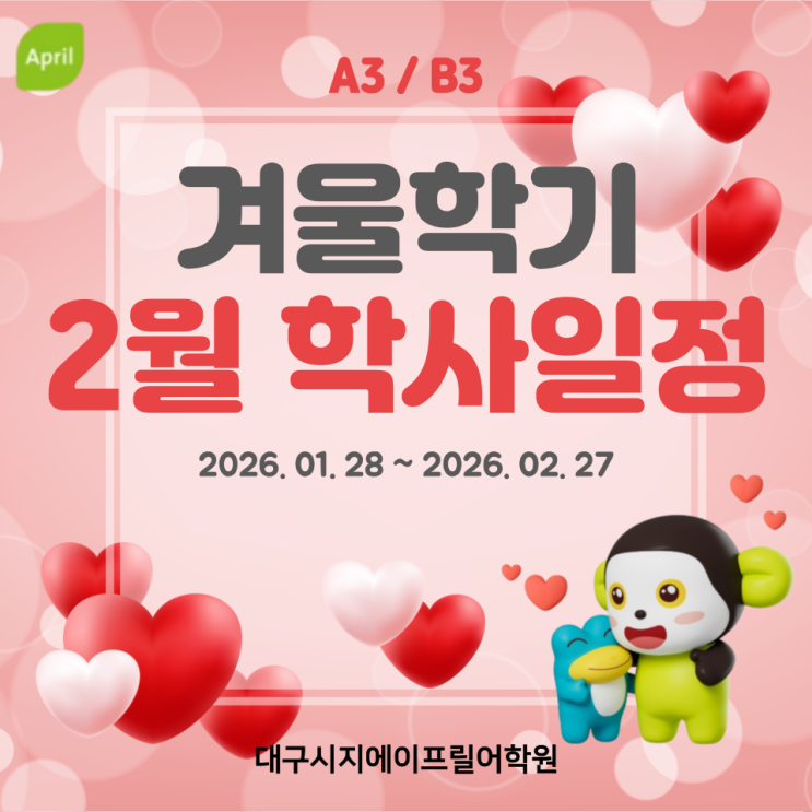 안녕하세요! 보다 효과적인 영어 학습의 시작, 시지에이프릴어학원입니다. 겨울학기의 마지막인 2월은 레벨별로 중요한 시험인 Term Test (중간평가), Achinvement Test (정기평가)가 있는 달입니다. 학사일정을 잘 참고하셔서 학습지도 부탁드립니다. ^^ 2월 주요 학사 일정 1. 겨울학기 2월 (A3/B3) 개강 월수목반: 1월 28일(수) 화수금반: 1월 28일(수) ※ 개강일에 새교재 지참 필수! * April Starter → Book3 교재 * Seedbed A / Seed1 A → A3 교재 * Seed1 B / Seed2 B / Sprout 1,2,3 B → B3교재 ★★ 2월 설연휴 휴강일 이후 4주차 2/19 부터 수업 주차별 Day1~3 학습요일이 원래대로 복귀합니다. *월수목반 - Day1: 월 / Day2: ....... <img src="https://blogthumb.pstatic.net/MjAyNjAxMjNfMjc1/MDAxNzY5MTM1NDQ1ODk1.hKtd7JZEGSOf9dDUXBES9pNWF8NziINNiVskEsUimrog.9qthVTd_PEfVAEufFWQY13sTTQRypt8MX0VjinNTxIUg.PNG/%C1%A6%B8%F1%C0%BB-%C0%D4%B7%C2%C7%D8%C1%D6%BC%BC%BF%E4_-003.png?type=s3" />