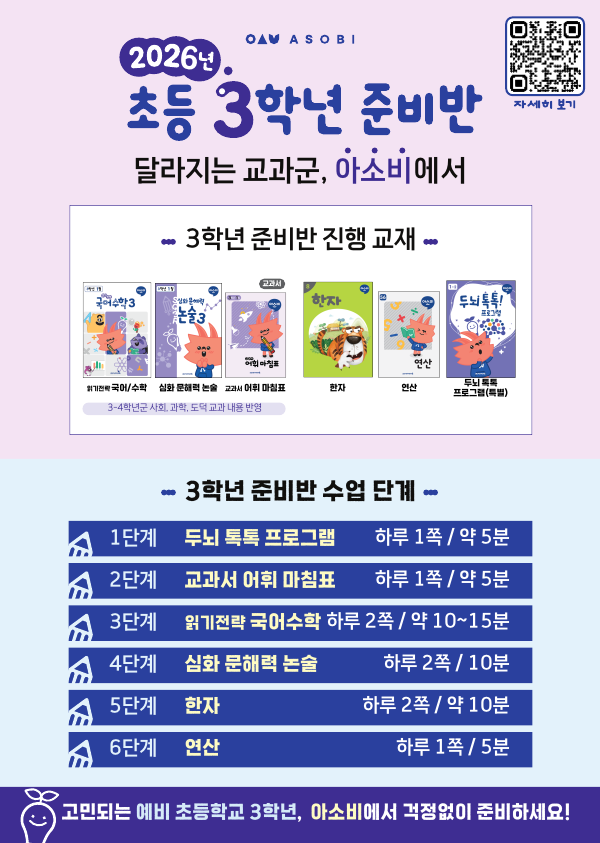 안녕하세요 :) 유치-초2 전문교육원 아소비 인천지사입니다. 이제 곧 고학년으로 접어드는 시기! 그런 의미에서 초등학교 3학년은 정말 중요한 시기가 아닐 수 없지요~ 아소비에서는 3학년 준비반이 예비 초3 1, 2월 두 달 간 특별하게 진행됩니다! 초등 교과 학습의 완성 단계! 예비 초3 과정은 3-4학년군 사회, 과학, 도덕 교과 내용을 반영한 융합형 교재로 학교 교과 학습을 탄탄하게 해주는 심화 학습 프로그램입니다. 1. 특별 프로그램 - 두뇌톡톡 아소비만의 특별 프로그램인 두뇌톡톡 프로그램은 아이들의 발달 수준에 맞는 학습 능력을 높여주는 프로그램으로 사고력(좌뇌), 상상력(우뇌), 집중력, 문제해결력까지 학습에 꼭 필요한 필....... <img src="https://blogthumb.pstatic.net/MjAyNTEyMTVfMTYx/MDAxNzY1Nzc1OTk5ODA4.zyLtdV8YvMhJ_d0G3kK848vczPd5fp1y56-hA_2dKRIg.3PBnjpdiigWEJ4rju8eRg-jgWIETWfbc0_wnIk1Jvdkg.PNG/image.png?type=s3" />