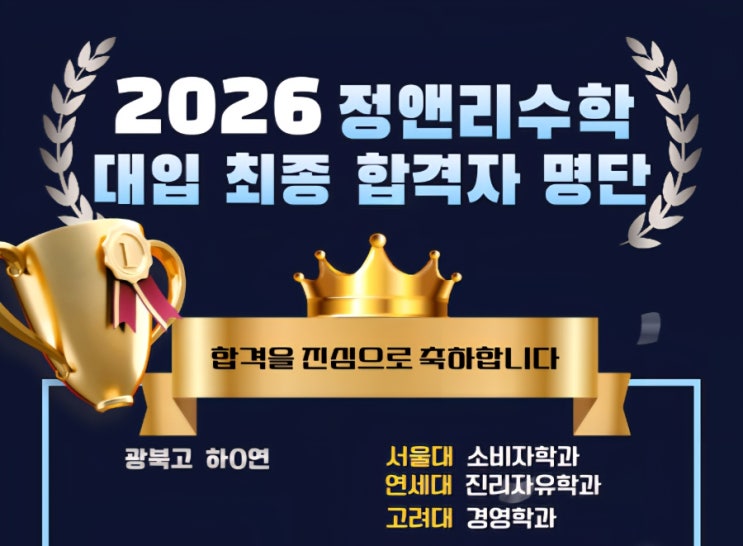 Since 2014 정앤리를 만나면 반드시 성장한다! ✨️"선생님, 저 붙었어요! 그 한마디에 밀려오는 안도감과 벅찬 감동 ✨️수학이 가장 어려웠던 아이가 꿈꾸던 대학에 합격하기까지 ✨️치열했던3년의 기록, 우리 정앤리수학 고3 학생들의 대입 합격 소식을 전합니다. 안녕하세요. 정앤리수학학원입니다. 유난히도 치열했던 2026학년도 대학입시가 마무리되었습니다. 그동안 밤낮없이 책상 앞을 지켰던 우리 아이들과 뒤에서 묵묵히 응원해 주신 학부모님들께 진심으로 존경과 축하의 마음을 전합니다. 수학 학원 원장으로 살면서 매년 겪는 입시지만, 아이들의 합격소식은 매년 처음인 것처럼 가슴이 뜁니다. 1. 포기하고 싶었던 순간들을....... <img src="https://blogthumb.pstatic.net/MjAyNjAyMjZfNDEg/MDAxNzcyMDM2ODE2MjAx.9hQHrm3pOg_xNnieQkxYikHLxbJdHvBJcnNO3zGs32cg.IMxLBnEYsPxCqXxrpz4BJCmJzNGnXVKO0xIqG23EzVEg.JPEG/900%A3%DF1772036655946.jpg?type=s3" />