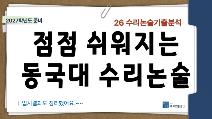 안녕하세요? 수종샘입니다. 오늘은 2026학년도 동국대 수리논술 기출문제 분석과 2027학년도 동국대 논술에 관심있는 학생이 알아둘 정보 정리하겠습니다. 26기출문제 분석 2026 기출 출제단원 출제경향은? 1) 기하는... 동국대는 대문항 3개중 1개 정도는 기하에서 계속 출제하고 있습니다. 하지만... 출제는 하되 난도는 교과서적인 내신개념수준으로 출제하는 것이 더 중요한 특징입니다. 이번에 출제된 정사면체,정팔면체의 이면각역시 모든 개념서의 첫머리에 등장하는 수준 정도입니다. 기하는 준비하긴 하되 내신공부수준으로 해두고 동국대논술을 본격적으로 준비할때 , 배웠던 개념을 잘 정리하는 수준이면 충분할 것입니다. 2) 확률과....... <img src="https://blogthumb.pstatic.net/MjAyNjAyMjZfMTI0/MDAxNzcyMDc3ODgwMzAw.eA5MZTXw4MfdSnnE3fmXSgWz3DC4NI7Py1nGAMGznUEg.Mk1Ao-8In0emw1USeO2ULpOKVlZRHFIPcbZsgZSSpjgg.PNG/%C1%A6%B8%F1%C0%BB_%C0%D4%B7%C2%C7%D8%C1%D6%BC%BC%BF%E4._%2860%29.png?type=s3" />