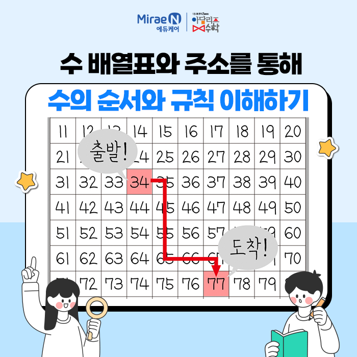 안녕하세요. 아담리즈수학 본사 미래엔에듀케어입니다. 오늘은 수의 순서와 규칙을 익히는 데에 도움을 주는 ‘수 배열표’에 대해 이야기 하려고 합니다. 여러분은 낯선 장소에 방문해 본 적이 있나요? 익숙하지 않은 장소에 찾아가려면 무엇을 알아야 할까요? 건물이나 장소를 찾기 위해서는 각각에 정해진 번호인 ‘주소’를 알아야 합니다. 주소는 일정한 순서와 규칙에 따라 만들어지며, 그 숫자를 따라가면 원하는 위치를 찾을 수 있습니다. 이처럼 수에 정해진 순서와 위치를 체계적으로 정리해 놓은 것을 ‘수 배열표’라고 합니다. 수 배열표는 일정한 순서와 간격에 따라 수를 나열해 놓은 표로, 배열 속에 있는 규칙을 찾아 다양한 문....... <img src="https://blogthumb.pstatic.net/MjAyNjAyMjVfMjcz/MDAxNzcyMDA0OTY4MjMy.2ucpvL2JcFl3yeYJLgOOmetAiek4rO3qlCjT-LbNxJsg.uQO-MqB8ded2YWM-il4jC1Ik24UgCVhRPfRuvUfhua4g.PNG/%B9%CC%B7%A1%BF%A3%BF%A1%B5%E02.png?type=s3" />
