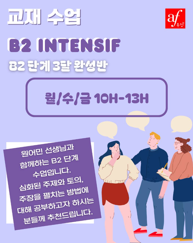 3개월 만에 프랑스어 B2 레벨 정복! 단기간에 프랑스어 B2 레벨을 달성하고 싶으신가요? 부산 알리앙스 프랑세즈의 **집중 과정(Intensif B2)**이 해답입니다! 체계적인 커리큘럼으로 빠르고 확실하게 실력을 향상시켜 드립니다. 수업 일정: 매주 월, 수, 금요일 ⏰ 시간: 오전 10시 ~ 오후 1시 (3개월 완성) ✨ 시너지 효과를 위한 추천 코스! (화/목요일) 집중 과정을 수강하시는 분들께는 화요일과 목요일 오전에 진행되는 다양한 워크숍을 병행하시는 것을 적극 추천합니다. 화요일 오전: Jongsuk 선생님과 함께하는 "Rendez-vous du mardi (회화)" 또는 Coline 선생님과 함께하는 "Action Réaction (구술....... <img src="https://blogthumb.pstatic.net/MjAyNjAyMjFfMTY2/MDAxNzcxNjM4MzI3OTY5.YGKQKV9D09b95RftDf59pxnMU6nX1fe917LOj_4_dJQg.VzetzfoG1QjkQhzGLNv-mD0D5ZI5ySqlxTdkyn5-c8Yg.PNG/image.png?type=s3" />