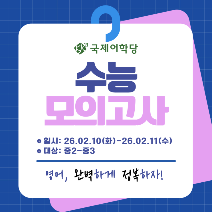 안녕하세요! 국제어학당 본원입니다. 국제어학당 본원에서는 3개월에 한번씩 분기별 수능 모의고사를 통해 학생들의 학습 성취도를 점검하고 있습니다. 국제어학당 본원의 수능모의고사는 실제 수능과 동일한 유형과 난이도로 구성되어 있어, 학생들이 매달 실전 감각을 기르고 학습 성과를 확인할 수 있도록 설계되었습니다! 주기적으로 수능 실전 문제를 풀이함으로써, 학생들이 실제 시험을 대비해 더 안정적이고 자신감 있는 학습을 이어갈 수 있습니다. 국제어학당 본원 수능모의고사 기본 정보 학생들이 좋은 성적을 받을 수 있도록 국제어학당 본원의 모든 선생님들이 응원할게요! 모두 모두 화이팅!! "오직 국제어학당 본원만이 가....... <img src="https://blogthumb.pstatic.net/MjAyNjAyMTBfMjUy/MDAxNzcwNzE4MzQ1MDMx.AQtL2hjFhQBC8L6eQngYl-pNNxehPl44F81jn-Gm1KUg.s4ZUmQH2peD_MDwPIKC-cfKoSIdLiQKlUi1IrpbeYk4g.PNG/%C1%A6%B8%F1%C0%BB-%C0%D4%B7%C2%C7%D8%C1%D6%BC%BC%BF%E4_-001_%2811%29.png?type=s3" />