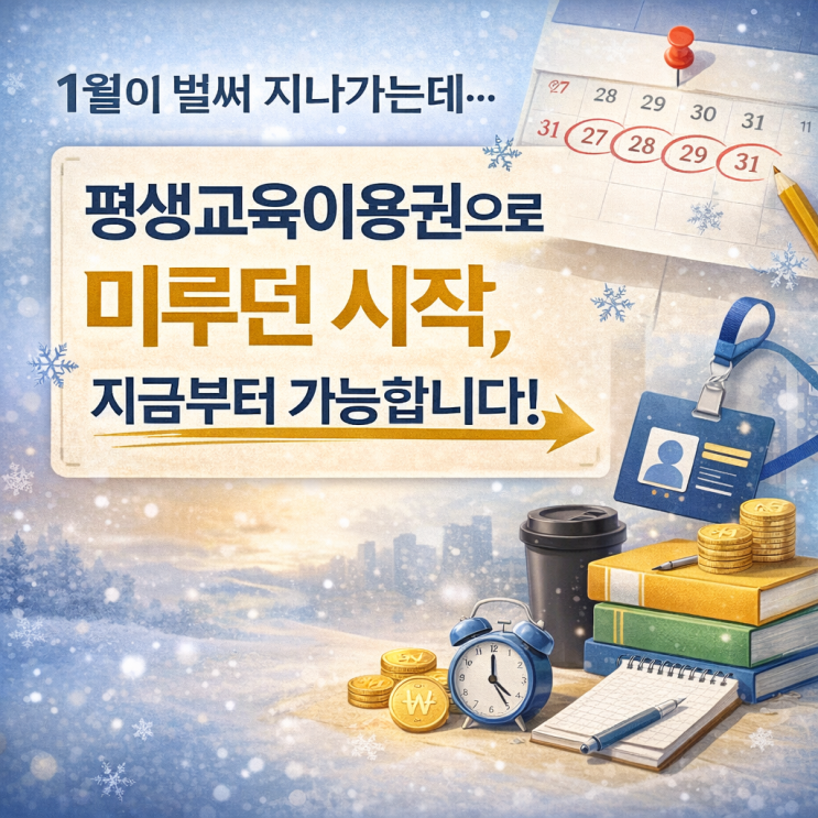1월이 다 지나가는 지금, 새해 다짐은 잘 지켜지고 있나요? 새해가 시작된 지 어느덧 한 달. 다이어리 첫 장에 적어둔 목표들, 아직도 마음속에만 남아 있지는 않으신가요? 지금이 바로 ‘결심을 실행으로 옮기기 가장 좋은 시기’입니다. 새해 목표를 현실로 만드는 방법 평생교육이용권 **평생교육이용권(구 평생교육바우처)**은 국가에서 성인 학습자를 위해 학습비를 지원하는 제도입니다. ✔ 연 최대 35만 원 지원 ✔ 자격증 · 취업 · 실무 · 자기계발 과정 가능 ✔ 지정 교육기관에서 사용 가능 ✔ 비용 부담 없이 바로 시작 가능 “언젠가”가 아니라 “지금” 시작할 수 있게 도와주는 제도 1~2월, 왜 평생교육이용....... <img src="https://blogthumb.pstatic.net/MjAyNjAxMjFfMTY2/MDAxNzY4OTg4NTg0NzQ3.PHACwFJUQOfnWDX8rxT4XIjleljlWmvxRJKQeEq6cfAg.OM_B11yqG0e_zFoJWy7lWlfyIYyB24M2hzSikxETn3sg.PNG/ChatGPT_Image_2026%B3%E2_1%BF%F9_21%C0%CF_%BF%C0%C8%C4_06_41_11.png?type=s3" />