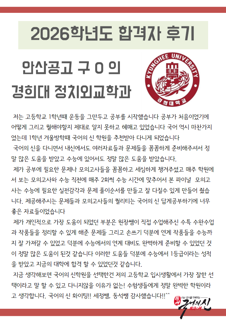 안녕하세요. 안산국어학원 국어의신학원입니다. 항상 이 시기에 올리는 합격후기입니다. 힘든 고3 생활, 누구보다 열심히하고 간절했던 구본의학생의 후기입니다. 멋진 경희대생이 되길 응원합니다. 고1 겨울방학때, 찾아온 학생 국어공부를 처음 시작한다고 열정이 넘쳤던 학생으로 기억합니다. 항상 맨 앞자리에 앉아서 수업에 집중하던 모습이 아직도 눈에 선합니다. 수능보고 난 후 바로 전화로 1등급이 나올거 같다며 떨리는 목소리! 그 학생의 후기입니다. 밑에 그림을 통해 읽어주세요 :) 안산국어학원은 역시 국어의신! #안산국어학원 #선부동국어학원 #안산수능전문국어학원 #안산국어전문학원 #사동국어학원 <img src="https://blogthumb.pstatic.net/MjAyNjAxMjRfNzYg/MDAxNzY5MjMwNzYyNjE0.M8il9ghC28ObzuB44YN7tBLSGYXkSPdqEr86QJvAFW8g.L6xXp962e56NA3TaCZRLK-r2RL7Yy5RuvQIHICN9WzYg.PNG/%B1%B8%BA%BB%C0%C7_%B0%E6%C8%F1%B4%EB_%C7%D5%B0%DD%C8%C4%B1%E2.png?type=s3" />