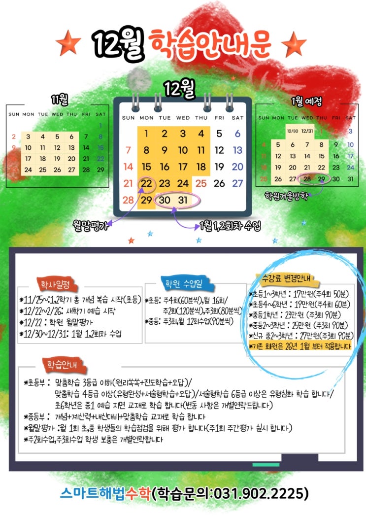 풍동/풍산/스마트해법수학/12월 학습안내문