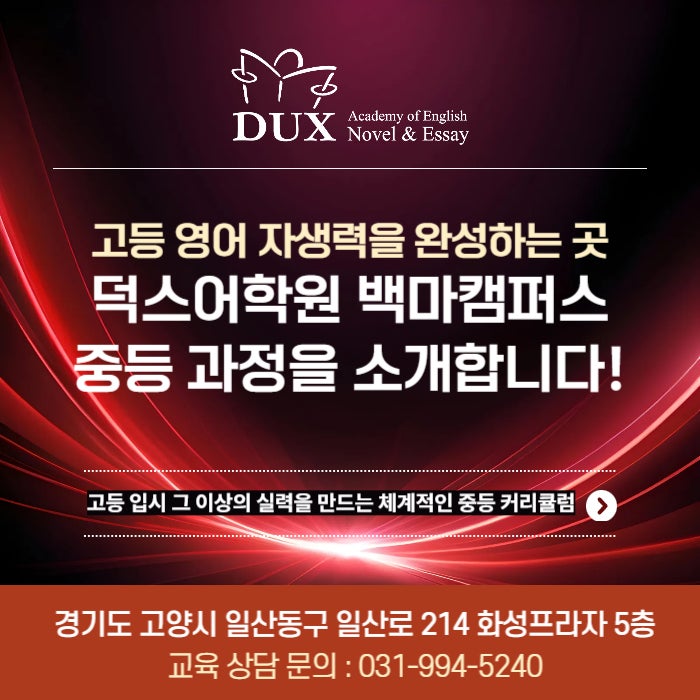 영어는 단순히 시험 점수를 위한 과목이 아니라, 사고력과 표현력을 길러주는 중요한 도구입니다. 고양시 일산동구 마두동에 위치한 덕스어학원 백마캠퍼스는 Real 100% 대치동 영어학습 시스템을 그대로 도입해, 대치동에서 검증된 전문 프로그램을 제공합니다. 초등 시기에 탄탄하게 다져온 영어 실력, 중학교에 올라가서 어떻게 꽃을 피워야 할지 고민이 많으시지요? 고등학교 진학 후에는 다른 과목에 쏟아야 할 시간이 절대적으로 많아지기 때문에, 중학교 시절은 영어의 '자생력'을 완성할 수 있는 마지막 골든타임입니다. 오늘은 고등 입시 그 이상의 실력을 만드는 덕스어학원 백마캠퍼스의 체계적인 중등 커리큘럼을 자세히 안....... <img src="https://blogthumb.pstatic.net/MjAyNTEyMThfMTE4/MDAxNzY2MDIyNjA3NTIz.AeHCgY9ZvQMMr-3NkFkJY1bm85dS_MGNbQ1mYkR1VaUg.URRFt4orCnPPtGAgHLEM61qoAlvHZTg3vppoMWlrIoUg.JPEG/%B8%B6%B5%CE%B5%BF%C1%DF%B5%EE%BF%B5%BE%EE%C7%D0%BF%F8_%281%29.jpg?type=s3" />