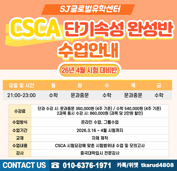 26년 9월 입학 마지막 CSCA 시험 4월 CSCA 시험 대비 단기속성반 개강 안내!! 2026 입시부터 CSCA 성적표는 필수서류 입니다. 중국 명문대 유학생 전형에서 CSCA 시험 성적은 눈에 보이는 지표로서, 중요한 부분을 차지하고 있습니다. 복단대 1차 합격자 발표를 보면 CSCA 시험 결과와 면접이 매우 중요한 합격의 key 였습니다. SJ글로벌유학센터 에서는 ✔ CSCA 3월 15일 시험 대비반 수업이 3월 14일에 종료되고, 4월시험 대비반이 3월 16일부터 개강을 합니다. 이런학생에게 추천합니다 CSCA 시험이 처음이라 막막한 학생 단기간 점수 상승이 필요한 학생 4월 시험을 안정적으로 준비하고 싶은 학생 과목별 수업시간 수학 : 월,수,금 21:00-23....... <img src="https://blogthumb.pstatic.net/MjAyNjAyMjRfMjYz/MDAxNzcxOTE4MTk5MzA2.9EtHlM4Gw7eIYyIWr6-cnhtdHrgr9W16Xh8P_77WXfUg.vsLS3wKUIfHi2WGQsJg6RVL2QIXlJwe_kwvuqvlWLocg.PNG/4%BF%F9%BD%C3%C7%E8%B4%EB%BA%F1%B9%DD.png?type=s3" />