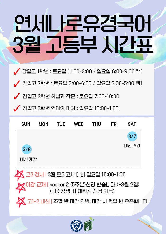 안녕하세요, 연세나로유경국어 유경쌤입니다! 어느새 겨울 방학 끝자락이네요! 우리 아이들의 26년도 첫 번째 관문인 '1학기 중간고사'가 다가오고 있습니다. 감일 지역 학교들의 출제 경향을 누구보다 완벽하게 꿰뚫고 있는 연세나로에서 내신 1등급을 향한 완벽한 수업 시간표를 공개합니다! [고1~고3] 내신 시간표 안내 ♥"우리 아이의 열정을 결과로 바꾸는 시간, 연세나로유경의 내신 대비가 시작됩니다."♥ 기본기부터 심화까지! 감일고 맞춤 커리큘럼 집중 분석 및 취약점 보완! 출제 포인트 쏙쏙 내신과 수능의 완벽한 조화!(고3) 연세나로의 모든 수업은 1. 각 학년 내신을 온전히 대비할 수 있도....... <img src="https://blogthumb.pstatic.net/MjAyNjAyMjVfMjg3/MDAxNzcyMDA1Nzk4NDIy.VjZs_HHqI5GDt_jlleWraRyZQIvNj1AFzxEIQPZJe1Qg.XlKPZ5vsSlCMrISLCbgdjXwZgjS3Z0e3-_-8gVn9lEcg.JPEG/26%B3%E2_3%BF%F9_%B3%BB%BD%C5_%BD%C3%B0%A3%C7%A5.jpg?type=s3" />