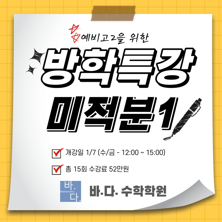 낯선 기호들로 가득한 [대수] 드디어 마주하게되는 무한대와 극한 [미적분1] 미리 접하고 오래 두고 보아야 친해 질 수 있습니다! ※이 외의 계획 중인 특강들도 결정되는대로 추가하겠습니다:) <img src="https://blogthumb.pstatic.net/MjAyNTEyMTRfMTk4/MDAxNzY1NzIwODQ3MDc5.MGnNKdk09i1z9oIK0JnHjLYrNhIUZONH60w1w6Bn5-wg.Ul-93j7Qywo_iql9cSTdSrnHfRQGlb2pCZjVOnqoRhcg.PNG/2.png?type=s3" />
