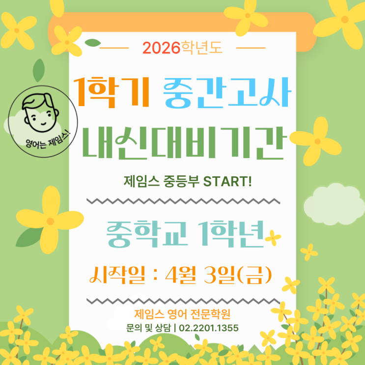 안녕하세요. 제임스 영어학원입니다~ 중등부 1학년 ~ 3학년 1학기 중간고사 시작일 안내드립니다. 중등부는 광남중, 양진중 내신대비 진행하고있습니다. 등록문의는 02 - 2201 - 1355로 연락 부탁드립니다. 감사합니다. <img src="https://blogthumb.pstatic.net/MjAyNjAzMDlfMjE0/MDAxNzczMDUzMzU5ODg1.vzcX4hBZUSKAidMEG3Jja6eotAHktaqB0IUgCdnwAdUg.YJAl4N9tkTl0tAZq05-d6QGKrCsao3FjxNRsDXj_fhUg.PNG/KakaoTalk_20260309_171829675.png?type=s3" />