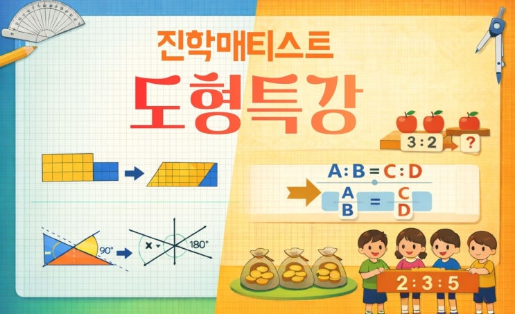재원생을 위한 도형 특강 안내 – 초등 도형 총정리 & 비·비율 집중 수업 – 초등 수학에서 도형은 단순한 계산 단원이 아닙니다. 공식을 외워 풀던 시기를 지나면, 도형은 곧 이해력과 사고력을 동시에 요구하는 영역이 됩니다. 특히 고학년으로 갈수록 문제 문장이 길어지고 조건이 복합적으로 제시되며 비·비율, 비례배분과 함께 출제되는 경우가 많아 한 번 개념이 흔들리면 계속 어려워지는 단원이 바로 도형입니다. 그래서 진학매티스트에서는 도형을 ‘풀이 요령’이 아니라 원리와 구조로 이해하는 수업을 중요하게 생각합니다. 이번 도형 특강은 그동안 학기 중에 쌓인 내용을 정리하고 재구성하는 시간입니다. 특강 일정....... <img src="https://blogthumb.pstatic.net/MjAyNTEyMTdfMTg0/MDAxNzY1OTUxODY2Mjg5.ALZnedOg6KeWp3mraWq_n6PoAR5yOexr-_CEAs8zw6wg.DRiAl4QcNeKAqkDDxFIvPUM4HXusSi8tf7-lHItG4Csg.JPEG/%B5%B5%C7%FC%C6%AF%B0%AD3.jpg?type=s3" />