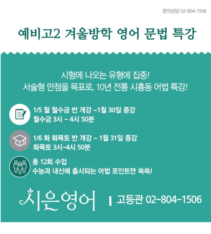 안녕하세요! 시은영어입니다! 다가오는 2026년 1월, 우리 예비 고2 친구들의 영어 실력을 수직 상승시켜 줄 겨울방학 문법 특강 소식을 들고 왔어요! 내신 서술형부터 수능 킬러 문제까지 한 번에 잡고 싶은 친구들 모두 주목해 주세요! ✍️ "내신 서술형은 어법이 결정한다!" 고등학교 영어, 단순 암기로는 한계가 있죠? 이번 특강은 시험에 꼭 나오는 핵심 유형에만 집중해서 효율적으로 공부합니다. 이번 특강의 3가지 Point! 자기주도식 학습: 수업 후 스스로 개념을 정리하고 고2~고3 문제에 직접 적용해 봐요! 반복을 통한 체화: 서술형 영작 연습을 반복하며 영어의 '감'을 확실히 깨우칩니다! 최고....... <img src="https://blogthumb.pstatic.net/MjAyNTEyMThfMTYw/MDAxNzY2MDU0MTE0MDY3.VNHEK3EfrnCMmPmLVGRLX4NFlYc8JFeQaORqzGlVq5gg.yeOn-BrNJOYfy1_9KwCJCtdpULcYdbFpVamz4RMvGoIg.JPEG/1.jpg?type=s3" />