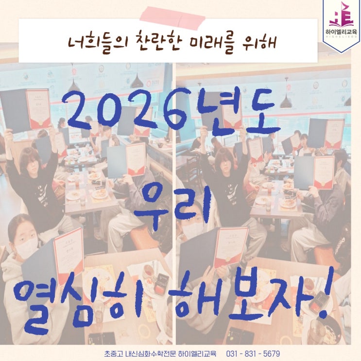 야호! 신난다!^^ 안녕하세요? 하이엘리&소마영재센터입니다. 2026년 3월의 새학기가 시작되었는데요~ 새학년 새학기에 대한 적응으로 바쁜 하루하루를 보내고 있을 우리 학생들과 학부모님들! 2026년 2월 27일(금) 하이엘리 교육 중고등부 방학 특강 종강 기념 < 쿠우쿠우 이벤트 >를 기록하며, 즐거웠던 추억을 안고 더욱 힘찬 새학기를 시작할 수 있는 에너지가 되기를 기대합니다✨️✨️ 우리의 뜨거웠던 겨울방학 특강에 대한 이야기 우리 이제 다시 열심히 달려보자! 학교에서 학원으로, 학원에서 집으로... 그리고 다시 학교로... 끊임없이 굴러가는 쳇바퀴 같은 하루하루 속에서도 우리아이들은 다양한 추억....... <img src="https://blogthumb.pstatic.net/MjAyNjAzMDVfMiAg/MDAxNzcyNjg4Nzg1NDc1.KP12i7_yctj8rATI7M-nF7py6slYXBXh1TPCPiABmMsg.8Xa60uXDVecBSYsEn3BkgGbckaeiiYhhubqeD0g3Zacg.JPEG/i_93iUd018svc17q4n64ee08cp_bu62hg.jpg?type=s3" />