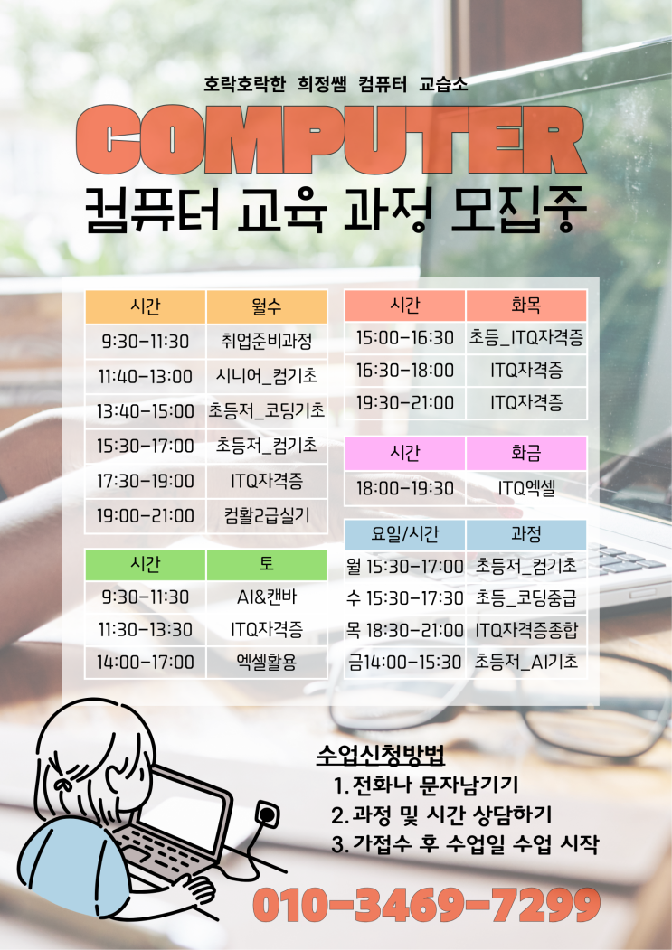 안녕하세요? 호락호락한 희정쌤 컴퓨터 교습소입니다~ 3월 정규반 학생 모집 아래의 이미지와 같습니다! 이미지 속 시간표 잘 왕니하시고 희망하는 수업 신청바랍니다~ 만약 다른 수업도 궁금하시면 문의 바랍니다^^ 감사합니다~! <img src="https://blogthumb.pstatic.net/MjAyNjAzMDVfMjE0/MDAxNzcyNzA5NDk2MTMw.VEMpOJhkLUeyiqLkbp-E6ErS-3HzTQ_6Jk8phsYJMXgg.-b_Ra4Ik05dXCmJ77f20F9XlwBmDllCw_PMhknKNiuog.PNG/20260310.png?type=s3" />
