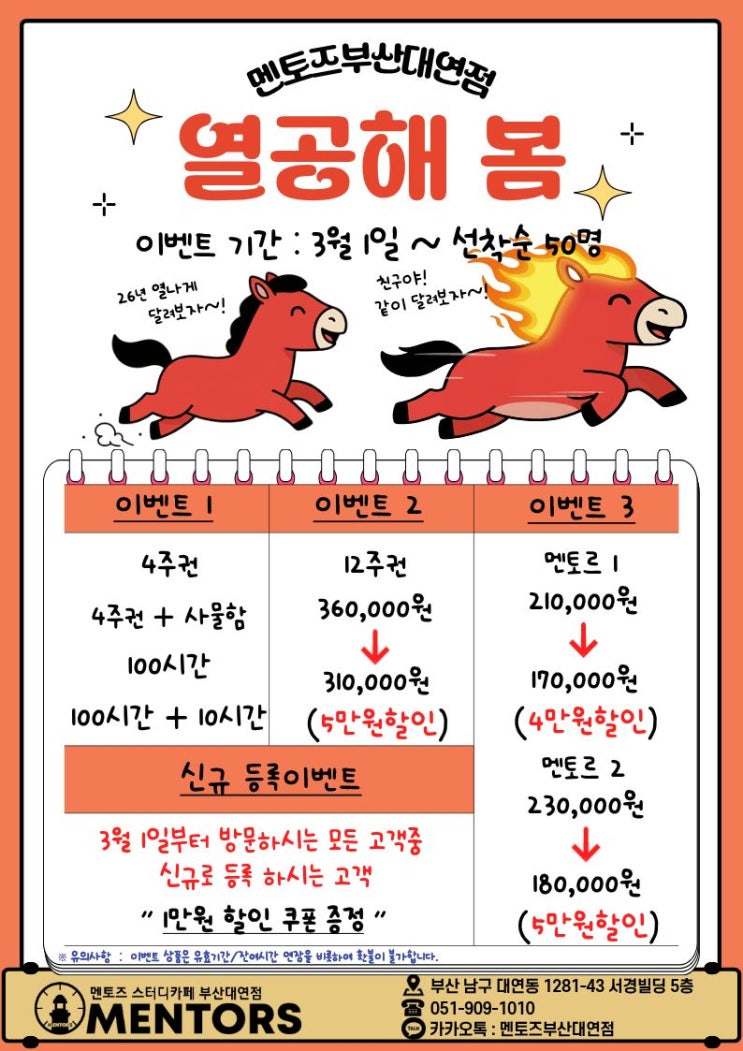 안녕하세요! 부산대연동 멘토즈 스터디카페입니다! 봄바람 불어오는 3월, 여러분 새 출발 공부 계획 세우고 계시죠? 우리 멘토즈 부산대연점이 선착순 50명 한정으로 '열공해 봄' 이벤트 진행합니다! 포스터 봤던 분들 많으실 텐데, 제가 직접 친절히 설명해드릴게요. 가격 할인 제대로 되고, 신규분들한테는 쿠폰도 드려요. 빨리 확인하고 오세요~! 이벤트는 총 3가지 + 신규 특전! 간단히 알려드릴게요 기간: 3월 1일부터 선착순 50명 마감! (늦으면 끝나요 ㅠㅠ) ⚠️ 주의: 이벤트권은 유효기간 지나면 연장/환불 안 돼요. 계획 잘 세우고 오세요! 기본 열공 패키지 (이벤트 1) 4주권 (기본 장기권) : 4주권 + 사물....... <img src="https://blogthumb.pstatic.net/MjAyNjAzMDFfMTgx/MDAxNzcyMzMwNzA2MjY4.5WQJuc3zB2Ushg0yTN_riJBC53FYXZzzw-LYYdclzKAg.iiYm9KdOiDcT-yQ0r4hDXGnBbzWPGg6bk095DRlOgtIg.JPEG/3%BF%F9%C7%D2%C0%CE%C0%CC%BA%A5%C6%AE_%C3%D6%C1%BE.jpg?type=s3" />