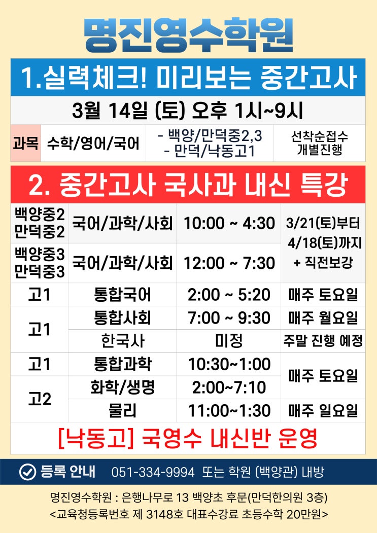 만덕 명진영수학원 중간고사 내신 시험 대비 특강 일정