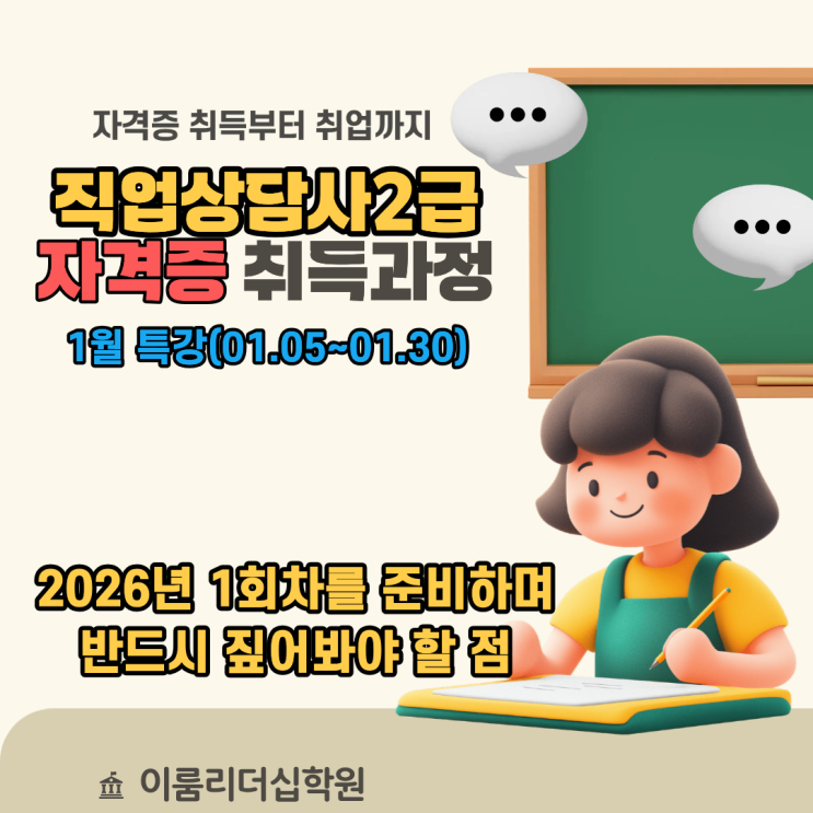 #직업상담사2급 #직업상담사2급자격증 #직업상담사시험준비 #2026직업상담사 #직업상담사1회차 #1월특강반 #자격증시험일정 #시험일정앞당김 #단기집중과정 #자격증준비과정 #중장년자격증 #경력전환준비 #취업자격증 #직업상담전공 #직업상담이론 #노동시장상담 #상담직무이해 #자격증정보제공 #시험대비학습 #전문자격과정 직업상담사 2급 자격증은 매년 꾸준한 수요가 있는 국가자격증 중 하나입니다. 고용센터, 위탁기관, 취업지원기관, 학교, 복지관 등 다양한 현장에서 활용도가 높아 중장년층과 경력전환을 준비하는 분들에게 특히 관심을 받고 있습니다. 2026년도 1회차 시험을 준비하는 과정에서는 예년과 비교해 한 가지 중요한 변화를....... <img src="https://blogthumb.pstatic.net/MjAyNTEyMTlfMjA3/MDAxNzY2MTA1NDk0ODMw.MNjSNom9LT1vDjFJXh1WO6im2AaD6c7GNiMwgnkqJsog.C68g3etWQKOML97iUiwrYCZbajkWK6l68JSFVeVoH9Eg.PNG/%C1%F7%BE%F7%BB%F3%B4%E3%BB%E7.png?type=s3" />