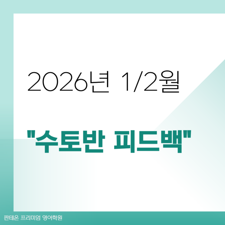 수토반 피드백 학습과정 찾는 방법입니다:) 수요일/토요일 반 피드백 권주광T (Jake T) 피드백 이아람T 피드백 판테온 프리미엄 영어학원은 수토 피드백을 더욱 활발히 진행하도록 하겠습니다 감사합니다! <img src="https://blogthumb.pstatic.net/MjAyNjAyMTNfMjE3/MDAxNzcwOTc0MzMyNDAx.kywvMqGM0WGNrWiI6uPWmzOLHPTKAP8vSShMFeEqX28g.DtDWlsMDBP36RwJJosUpp73jlXT-M7y2d0IXTbZCOuIg.PNG/%BC%F6%C5%E4%B9%DD_%C7%C7%B5%E5%B9%E9-001_%281%29.png?type=s3" />