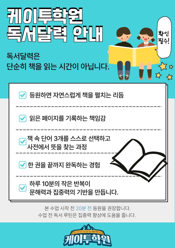 하루 10분, 아이의 리듬을 되찾는 시간 안녕하세요, 케이투학원입니다. 요즘 아이들이 책을 잘 읽지 않는다고 말합니다. 하지만 우리는 조금 다르게 생각했습니다. 아이들이 책을 싫어하는 것이 아니라, 읽는 시간이 일상에서 사라진 것은 아닐까. 최근 국가에서도 ‘독서국가선포’를 통해 독서의 중요성을 다시 이야기하고 있습니다. 그만큼 우리 사회 전체가 아이들의 삶에서 ‘읽는 리듬’이 흐려지고 있다는 사실을 느끼고 있다는 뜻일 것입니다. 그래서 이니티움관은 거창한 프로그램 대신 아이들의 하루 속에 작은 10분을 심었습니다. 독서달력은 단순히 책을 읽는 시간이 아닙니다 등원하면 자연스럽게 책을 펼치는 리듬, 읽은 페이지를....... <img src="https://blogthumb.pstatic.net/MjAyNjAyMjRfMTgg/MDAxNzcxOTMwMTQwMTg0.Vqa9GGBIx1R5Rd9SPFhBcLXfC6f_ocyMVQedfoRrykwg.Jw7lxq_OKjvzSax2JFQLZflM1RakgdaNY9JBuJkVbisg.JPEG/%B5%B6%BC%AD%B4%DE%B7%C2-001.jpg?type=s3" />