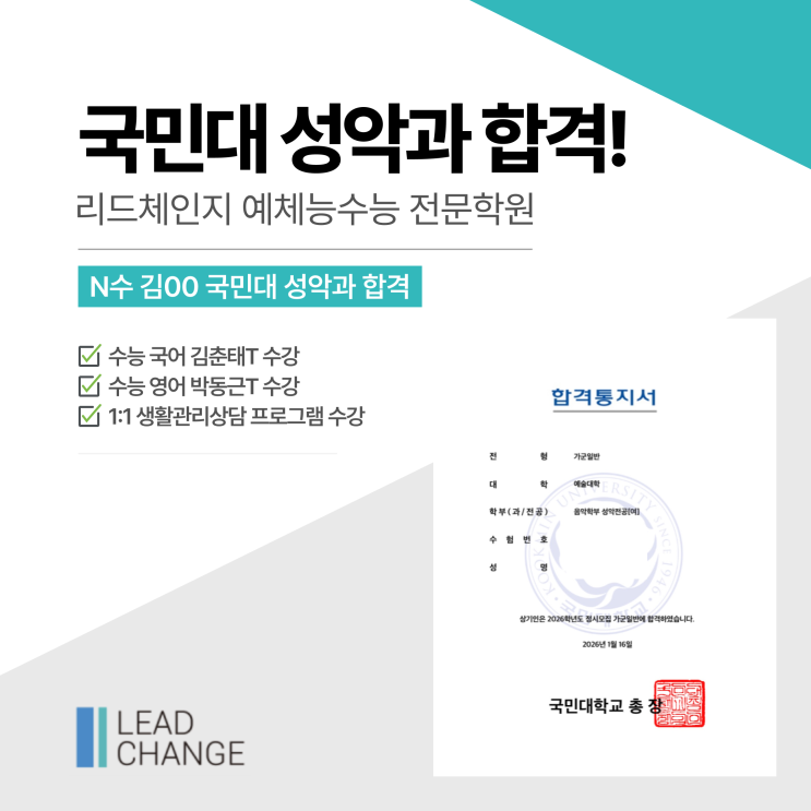 #광진구입시학원 #광진구수정시수능학원 #광진구예체능수능입시학원 #예체능음대수능정시학원 #예체능미대수능정시학원 #예체능체대수능정시학원 #체대입시 #음대입시 #미대입시 #체대합격 #음대합격 #미대합격 #국민대합격 #국민대성악과 #국민대성악과합격 #예체능학원 #예체능입시 #예체능정시 #예체능국어학원 #예체능영어학원 #예체능재수 #미대재수 #음대재수 #체대재수 #광진구학원 #광진구정시학원 #정시대비 #2026수능 #2026입시 안녕하세요! 예체능 전문 수능학원 리드체인지입니다. 최근에 정시 합격자 발표가 나왔는데요, 기쁜 소식을 전해드리게 되었습니다 [ 김OO 학생이 국민대학교 성악과에 최종 합격했습니다! ] 특히....... <img src="https://blogthumb.pstatic.net/MjAyNjAyMTFfMTEg/MDAxNzcwODA0MDY3MDY3.5ldJioD2jOH9cJBAdPKKxsMN_YchEkZYl9kWdcNtIiIg.Gw3Uo5OECkP9eDSfNnfu6ecT6Q1MT9CHJbMSxxd-dP0g.PNG/%B1%B9%B9%CE%B4%EB_%BC%BA%BE%C7%B0%FA_%B1%E8%BC%F6%C0%CE.png?type=s3" />