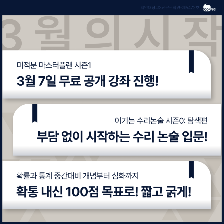 안녕하세요, 백인대장 수학학원입니다. 올해는 미적분 과목이 수능에서 출제되는 마지막 해입니다. 공통과목에 포함되었던 수2 과목은 미적분1로 명칭이 변경되며, 선택과목에 포함되었던 미적분 과목은 각 학교 내신 과목으로 편성되고 수능에는 포함되지 않습니다. 현 고3 학생들과 N수생들은 변화하는 교육과정을 맞이하기 전, 마지막 수능을 앞두고 있습니다. 따라서, 이번에 반드시 좋은 결과를 내어 대학에 진학하여야 합니다. 현재 수능 수학 체제에서 중요한 것은 선택과목 학습입니다. 특히, 미적분 과목에서 고득점을 노려 표준점수의 이점을 노려야 합니다. 또, 수능을 준비하는 학생들에게 있는 또 다른 기회인 수리논술을 반드시 준....... <img src="https://blogthumb.pstatic.net/MjAyNjAyMjFfMTky/MDAxNzcxNjUyNjgzNDc5._4vRrO9Vc_Ncjettpdnuggrjhm3fDKhVesoAHVweDEgg.HvR_IrrmwAZUWpyd70a5B4sGwAMWne5EhkNtktMwn9Ug.PNG/21%28%C5%E4%29_%BA%ED%B7%CE%B1%D71.png?type=s3" />