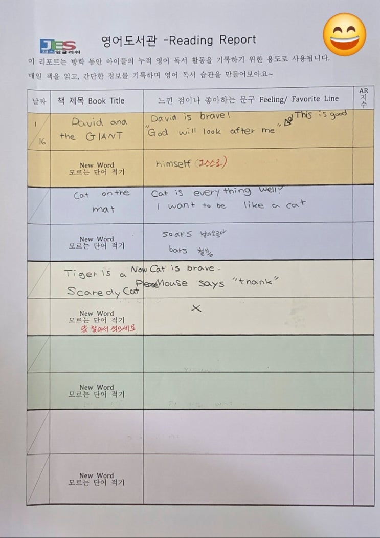 #초등원서읽기 #방학영어특강 아이들의 달라진 영어 실력 이번 방학, JES잉글리쉬에서는 원서를 활용한 초등 원서읽기 집중 프로그램을 진행했습니다. 이번 글은 수업 소개가 아닌, ✔ 실제 Reading Report ✔ Comprehension Check 결과 ✔ 어휘 기록지 를 바탕으로 한 학습 결과 분석 보고입니다. 1️⃣ 독해 정확도 향상 (Comprehension Check 분석) 사진 자료에서 확인할 수 있듯이, 아이들은 단순 줄거리 이해를 넘어 다음과 같은 영역에서 정확도를 보였습니다. ✔ 사건 이해 능력 David가 무엇으로 Goliath와 싸웠는지 정확히 이해 Tiger가 두려워했던 대상 파악 Cat이 팀에 합류하게 되는 과정 이해 ✔ 원인–결과 구조 파악 “Why did Da....... <img src="https://blogthumb.pstatic.net/MjAyNjAyMjFfNjcg/MDAxNzcxNjMyODY1MTg2.3H8kvyLdkeumZzl6z_LewbrWvj5TQTw00gHIlCuptM4g.mZfgwSVKJWv2TzaNjuc-Q9h_8OSBWkzgU31tz8ugW40g.JPEG/900%A3%DF20260221%A3%DF085344.jpg?type=s3" />