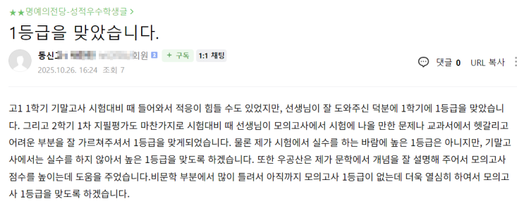 1등급을 맞았습니다. 동신고1 박** 고1 1학기 기말고사 시험대비 때 들어와서 적응이 힘들 수도 있었지만, 선생님이 잘 도와주신 덕분에 1학기에 1등급을 맞았습니다. 그리고 2학기 1차 지필평가도 마찬가지로 시험대비 때 선생님이 모의고사에서 시험에 나올 만한 문제나 교과서에서 헷갈리고 어려운 부분을 잘 가르쳐주셔서 1등급을 맞게되었습니다. 물론 제가 시험에서 실수를 하는 바람에 높은 1등급은 아니지만, 기말고 사에서는 실수를 하지 않아서 높은 1등급을 맞도록 하겠습니다. 또한 우공산은 제가 문학에서 개념을 잘 설명해 주어서 모의고사 점수를 높이는데 도움을 주었습니다. 비문학 부분에서 많이 틀려서 아직까지 모의고사 1등....... <img src="https://blogthumb.pstatic.net/MjAyNjAzMTBfOTMg/MDAxNzczMTI4MTIwNjM4.a8D_LAXJURhJWIbLXbPtJO-tHq6IFoW3Os4PpKNR2jkg.OTcC6zc4qplg9qCf1TYjD1Jl6u0NlrUKSt-GWpLBJgIg.PNG/image.png?type=s3" />