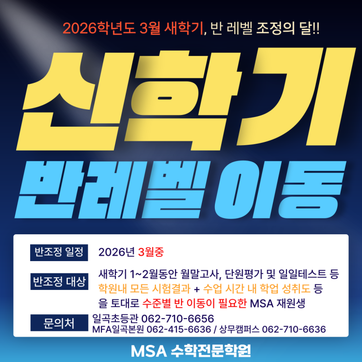 안녕하세요, MSA수학학원입니다. 2026년 3월 MSA재원생 정기 반 레벨 이동 안내입니다. 새학년 개강 후 학원 내 모든 시험결과 및 수업시간 학업성취도를 종합적으로 분석하였습니다. 이를 바탕으로 학생 개개인에게 가장 적합한 난이도와 속도의 수업을 제공하고자 수준별 반 조정을 시행합니다. 수준별 학습 이동이 필요한 학생들은 개별로 연락 드릴 예정입니다. (연락이 없는 경우, 기존반이 유지됩니다.) 우리 아이들이 가장 자신감을 느끼며 효율적으로 공부할 수 있는 최상의 학습 환경을 유지하겠습니다. 감사합니다. <img src="https://blogthumb.pstatic.net/MjAyNjAyMjNfMTc3/MDAxNzcxODI3MjYxOTg1.Whe_x-xqkHmHusjg-Y5GGYIBBxXyCafshUMM-JYP-U4g.dcvDLSW-ql_U_j_SHjsFuYpNacrgW3DvJDBH-pisRpgg.PNG/3%BF%F9_%B9%DD%B7%B9%BA%A7-%B9%DD%C1%B6%C1%A4-%B1%E2%B0%A3-%BE%C8%B3%BB-002.png?type=s3" />