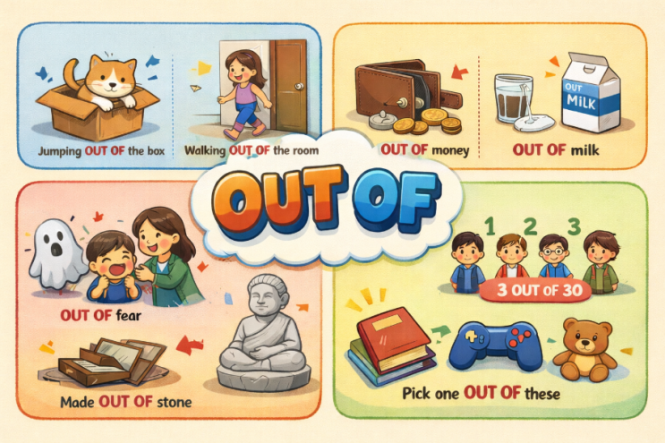 오늘 수업에서 정리한 전치사 표현 out of 완전 정복하기 단순히 “밖으로”라고만 알고 있으면 독해할 때 막히는 표현이 바로 out of입니다. 그래서 아이들과 함께 의미를 6가지로 나누고, 주어+동사가 들어간 문장으로 정리해 보았습니다. 1️⃣ 밖으로 (이동) The boy ran out of the house. → 그 소년은 집 밖으로 뛰어나왔다. 공간 안에서 밖으로 나올 때 사용하는 가장 기본 의미입니다. 2️⃣ 다 떨어진 / 없는 상태 We are out of milk. → 우리는 우유가 다 떨어졌다. 시험에서 정말 자주 나오는 표현입니다. money, gas, time 등과 함께 많이 쓰입니다. 3️⃣ ~때문에 (이유, 감정) She helped him out of kindness. → 그녀는 친....... <img src="https://blogthumb.pstatic.net/MjAyNjAyMTRfMTg3/MDAxNzcxMDc5NTAyMjU0.DSIBFDHgDzwi4pzq2mPE_OIwSE_rPRLRtzPWka8CaUQg.vx7L3loH7ekB8ZVVQNa6ZzpZe3t31fz09hIG40B4dqAg.PNG/900%A3%DFfile%A3%DF000000007f7071fa8958c4325f9c117a.png?type=s3" />