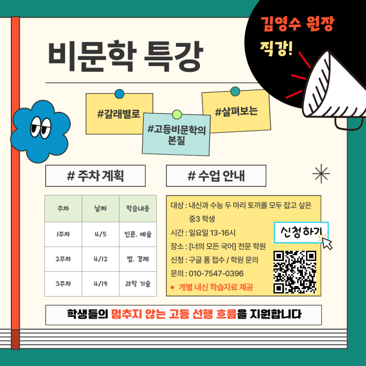 안녕하세요, [너의 모든 국어]입니다. 본격적인 내신 대비 기간이 다가오고 있습니다. 하지만 우리 아이들의 국어 공부, 내신에만 머물러 있어도 괜찮을까요? 내신 기간에도 고등 선행을 이어 나가고 싶어 하는 학생들을 위해 준비하였습니다. ️ 주차별 커리큘럼 (3주의 몰입) 1주차 (4/5): 인문·예술 2주차 (4/12): 법·경제 3주차 (4/19): 과학·기술 왜 [너의 모든 국어]여야 할까요? 김영수 원장 직접 강의: 압도적인 강의력으로 독해의 본질을 전수합니다. 내신 완벽 서포트: 특강 수강생에게는 '학교별 맞춤형 개별 내신 학습자료'를 무상 제공하여 현재의 성적까지 확실히 책임집니다. 멈추지 않는 흐름: 고등 선행의 연....... <img src="https://blogthumb.pstatic.net/MjAyNjAzMTlfMjI5/MDAxNzczOTIzOTY4NjMz.fSLGwbDOKAKO4W3pp84RXWT6otpi0ls3o7c4MjQXZGAg.lEJSSfwop3aJlIF5eA1iiBcaY68GHv2QrMkLsjp8cK4g.PNG/%BA%F1%B9%AE%C7%D0_%C6%AF%B0%AD.png?type=s3" />