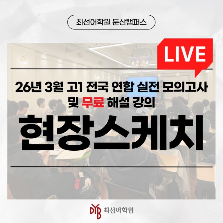 DYB 모의고사 1등급 프로젝트! 26년 3월 DYB 고1 전국연합 모의평가 영어 특강 현장 스케치 안녕하세요, 최선어학원 둔산캠퍼스입니다. DYB 모의고사 1등급 프로젝트! 지난 3월 25일, DYB 김영민 선생님과 함께한 26년 첫 번째 <고1 전국 연합 모의평가 영어 영역 무료 쪽집게 특강> 이 성황리에 진행되었습니다. 많은 학생들이 참여하여 실제 시험과 같은 긴장감 속에서 대강당을 가득 채워 열정적인 학습 분위기를 만들어주었습니다. DYB 고1 모의고사 특강 핵심 포인트 - 실전 70분 응시를 통한 집중력 훈련! - 1등급 달성을 위한 전략 제시! - 실전 감각 높이는 맞춤형 문제 풀이 접근법! DYB 고1 모의고사 특강 구성 1부) 26년 3월 고....... <img src="https://blogthumb.pstatic.net/MjAyNjAzMjdfMTQy/MDAxNzc0NjA1MzU2MDYx.Uu3EtwXQU4757pNbJgSdHGnURhTfuciszBRaQ3gT8YYg.wB7SeMd3qvob5S0bhVHlMrPZessriM9jqIuz6AflbFcg.JPEG/001.jpg?type=s3" />