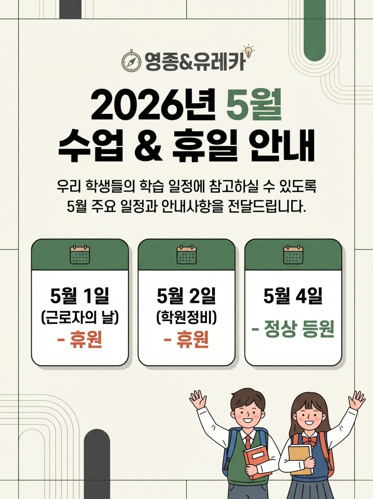 [유레카] 5월 수업&휴일 안내 안녕하세요, 전민유레카입니다 5월 학원 일정과 관련하여 안내드립니다. 수업 일정에 참고하실 수 있도록 아래 휴원 일정을 확인 부탁드립니다. [ 5월 휴원 일정 ] 5월 1일 ( 금 ) : 휴원(근로자의 날) 5월 2일 ( 토 ) : 휴원(학원정비) 5월 4일 ( 월 ) : 정상 등원 ※ 해당 기간에는 수업 및 상담이 진행되지 않습니다. 일정 확인에 불편 없으시길 바라며, 항상 자녀의 학습을 위해 함께해 주셔서 진심으로 감사드립니다. 남은 중간고사 잘 준비하고 시험볼 수 있도록 힘쓰겠습니다. 중간고사 이후에 잘 휴식하고 5월에도 아이들이 꾸준히 성장할 수 있도록 최선을 다하겠습니다. 감사합니다 <img src="https://blogthumb.pstatic.net/MjAyNjA0MjhfMTAg/MDAxNzc3MzY1NTYxMDAw.1FKxFMqAZEZpf9KvG773ajZGjx2RbPi61AjCVXpQLZog.5BkO-8xawgRq-Z7ho3Q6t7zaKHsTrOUDfXi238EL4lMg.JPEG/%C7%D0%BF%F8_%C8%DE%BF%F8%BE%C8%B3%BB.jpg?type=s3" />