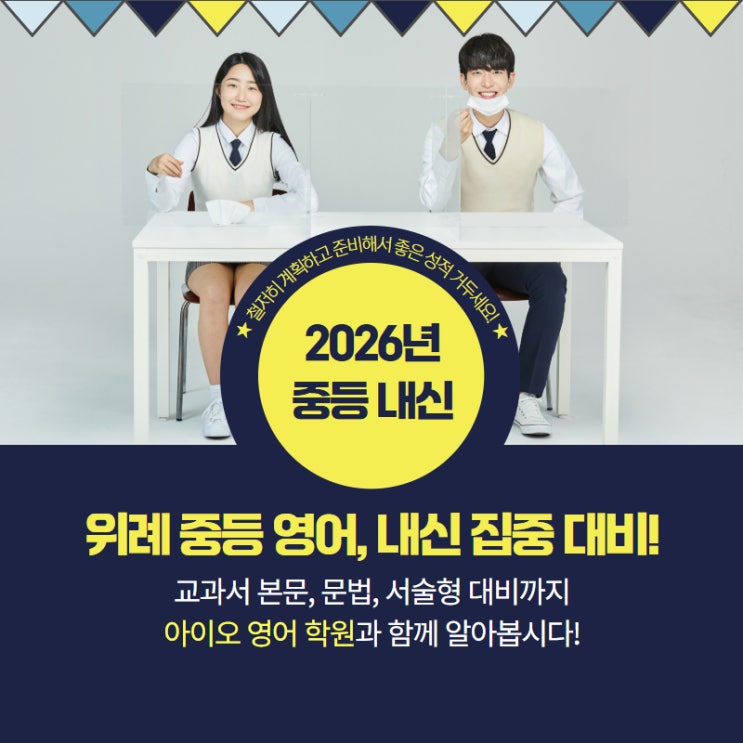 안녕하세요. 아이오 영어학원 위례점입니다. 3월은 한 해의 학습 방향이 결정되는 중요한 내신 시기입니다. 특히 중학생에게 내신 성적은 앞으로의 학습 자신감과 학습 습관을 형성하는 데 큰 영향을 미칩니다. 많은 학생들이 첫 시험을 앞두고 여러 가지 고민이 많을 거예요. 실제로 중등 영어 내신은 교과서 본문, 문법, 서술형 대비까지 체계적으로 준비해야 하기 때문에 미리 준비하는 것이 중요합니다. 중등 내신, 무엇이 중요할까요? 아이오 영어 학원과 함께 대비해 봅시다! ✔ 교과서 완벽 이해 중학교 영어 시험은 교과서 본문과 학교 프린트에서 대부분 출제됩니다. 본문 해석, 문장 구조, 주요 표현까지 정확히 이해하는 것이 중요합....... <img src="https://blogthumb.pstatic.net/MjAyNjAzMDlfMTA2/MDAxNzczMDU1MDQwMDc2.rBlVQteYNE6-I0n8lyORi1QGRIam4MOvju8dprqyS1kg.h7wN5q4Nszxprax28oC7uM70X6MkqgL2BFmIIp8fZpQg.JPEG/%BE%C6%C0%CC%BF%C0%C7%D0%BF%F8_%C0%A7%B7%CA%C1%A1_%C1%DF%B5%EE%BF%B5%BE%EE_%C1%DF%B5%EE%B3%BB%BD%C5.jpg?type=s3" />