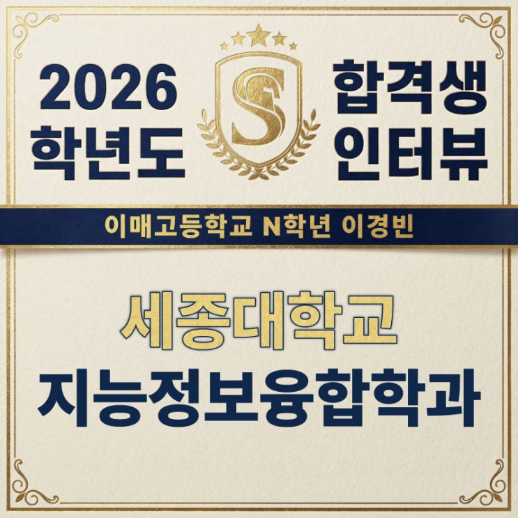 이경빈 학생은 수리논술 전형을 통해 세종대 지능정보융합학과에 합격한 학생입니다. 아무래도 수리논술 전형을 통해 합격한 만큼 해당 전형에 대한 이야기를 자세히 해주었습니다. 학생 본인이 어떻게 수리 논술 전형을 준비했는지, 그리고 수리논술 전형을 준비하는 학생들에게 도움이 될 수 있는 이야기도 많이 해주었습니다. 다시 한번 인터뷰에 응해준 이경빈 학생에게 감사드립니다. <img src="https://blogthumb.pstatic.net/MjAyNjAzMDVfMTc5/MDAxNzcyNjk4NDI0MjYy.JR-sNpXo2P_emPUOBHEZNtLGQnbgNRocLpgsp8AYMKYg.XYM3aPOCUBho217PmI0oZaUU7EytoT_6fQ3sEPBHz-og.JPEG/%C0%CC%B0%E6%BA%F3.jpg?type=s3" />