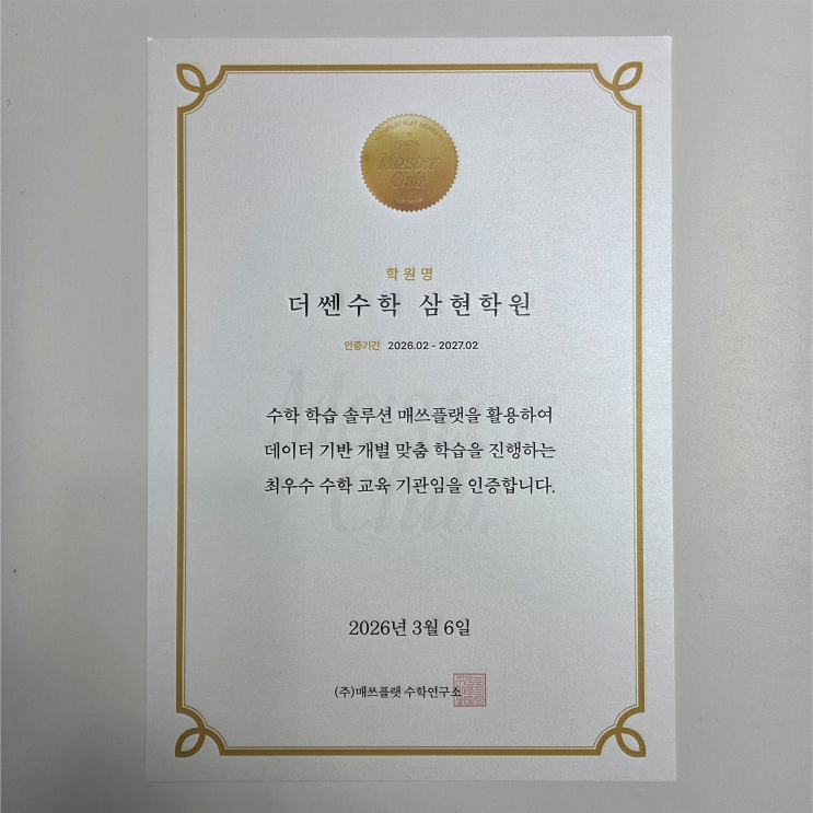 안녕하세요. 더쎈수학 삼현학원입니다. 저희 학원이 2026 매쓰플랫 플랫멤버스 ‘마스터클럽’ 데이터 기반 개별 맞춤 교육 기관으로 선정되었습니다. 매쓰플랫을 활용한 학습 데이터를 기반으로 학생 개개인의 수준과 학습 상황에 맞는 맞춤 학습 관리를 꾸준히 진행해 온 결과라고 생각합니다. 무엇보다도 항상 성실하게 공부해 준 학생들과 믿고 맡겨주신 학부모님들 덕분입니다. 진심으로 감사드립니다. 앞으로도 학생 한 명 한 명의 학습 과정을 꼼꼼하게 관리하며 더 좋은 결과로 이어질 수 있도록 최선을 다하겠습니다. 감사합니다. 궁금하신 부분 또는 상담 예약은 전화 031-852-3493 또는 아래 링크를 통해 가능합니다:) http://pf.kaka....... <img src="https://blogthumb.pstatic.net/MjAyNjAzMDlfMTg3/MDAxNzczMDI5MTIzNTI4.zZOmo7GQkLeMMg6sIs5ftgJ7xvJGO-LUyLuax_hcQR0g.kwjMqEbg8Hu3Oh53uqwXvh4JTY1wHMK_j-tjv13xFHUg.PNG/image.png?type=s3" />