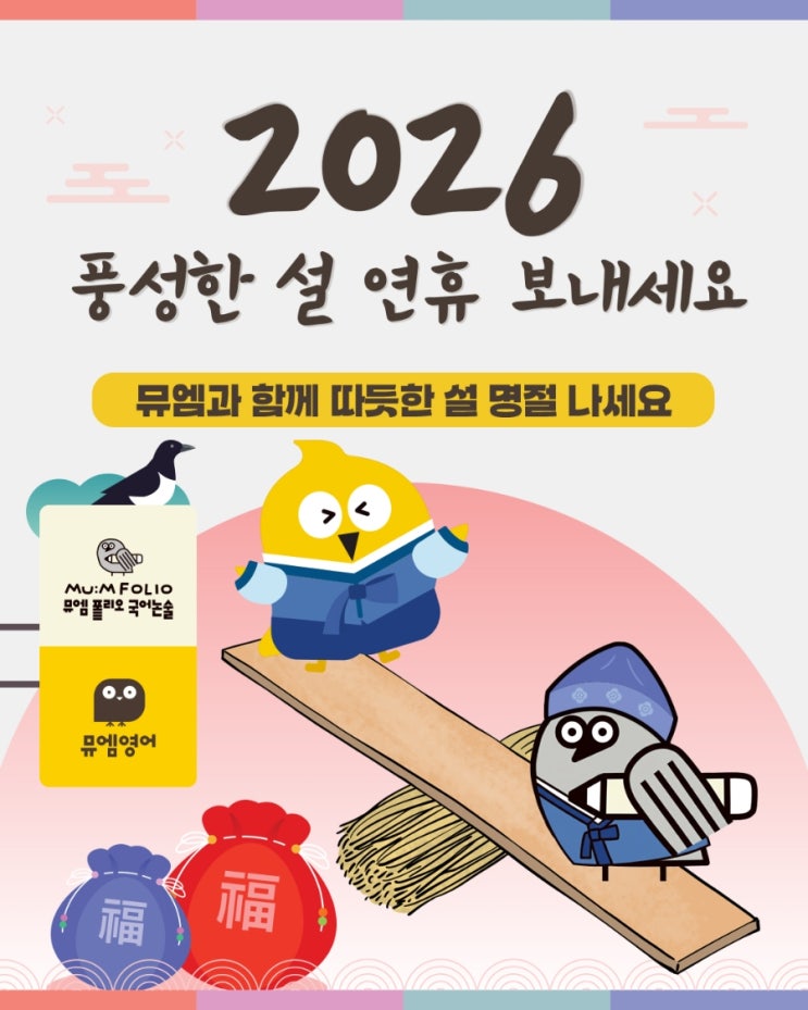 안녕하세요! 뮤엠영어 X 폴리오 국어논술 중동점입니다. 2026년 설 명절을 맞아 잠시 충전의 시간을 가집니다. 가족들과 함께 따뜻하고 웃음 가득한 연휴 보내시길 바랍니다! 설 연휴 휴원 및 개강 안내 휴원: 2월 16일(월) ~ 2월 18일(수) 개강: 2월 19일(목) 정상 수업 시작! 연휴가 끝나는 19일부터 우리 아이들의 새 학기 실력을 위해 다시 힘차게 달리겠습니다. 연휴 기간 중에도 문자를 남겨주시면 확인 후 순차적으로 연락드리겠습니다. 새해 복 많이 받으세요~!! 뮤엠영어 X 폴리오 국어논술 중동점 상담문의: 010-4146-3226 ✨ 영어 & 논술 - 1:1 맞춤형 밀착 관리 <img src="https://blogthumb.pstatic.net/MjAyNjAyMTNfMTI0/MDAxNzcwOTY3MjI1NzIw.XSY6LQpY2t6JW_fYHR5iS5hDoNjwcjFbZkh5HiGpLI0g.xs2-uuIqaJb5bjsU6kpMvVc1ot3fWqyG05toAxFI_10g.JPEG/900%A3%DF1770949415234.jpg?type=s3" />