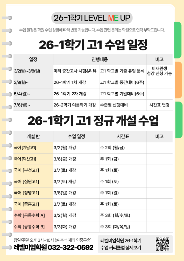 안녕하세요 레벨미업학원입니다. 3/2(월)부터 26학년도 1학기 고등부 정규 수업이 순차 개강합니다. 수강안내문 안내드리오니 개설 수업 및 수업별 커리큘럼 확인을 원하시는 경우 참고 부탁드리겠습니다 ^^ 아래 수업 일정은 학원 수업 상황에 따라 변동될 수 있습니다. 수업 진행은 레벨테스트 후 상담 진행 통해 안내드리고 있습니다. 관련 문의는 학원으로 연락 부탁드리겠습니다. 감사합니다 ☺️ 26-1학기 레벨미업학원 고1 정규수업 수강안내문 상담 및 문의 <img src="https://blogthumb.pstatic.net/MjAyNjAyMTZfMjkz/MDAxNzcxMTY4NjA4MTEz.eYKF5jx1J03dyZB8GKLhw0kQUL4mFJakVkeYjFdgw_Qg.5T6BMSQaLE5sFlYIUyL-VqRB-O6GdDPgaD0DmNbjj84g.PNG/1.png?type=s3" />
