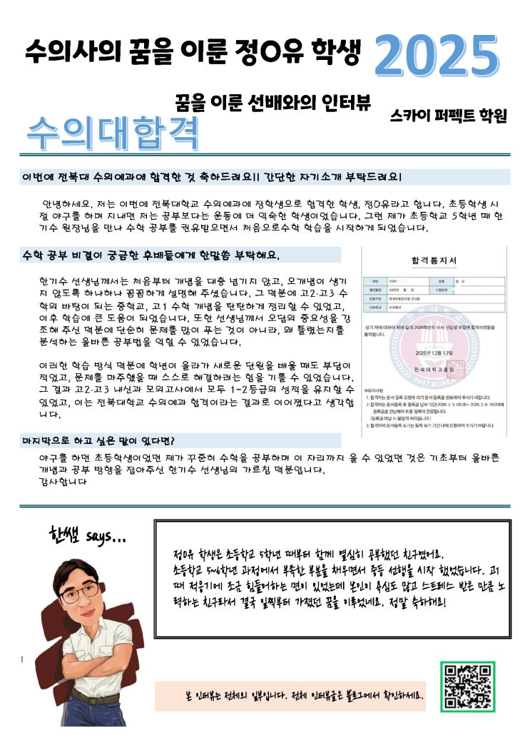 수의사의 꿈을 이룬 정O유 학생 [고덕수학전문학원] 스카이퍼펙트
