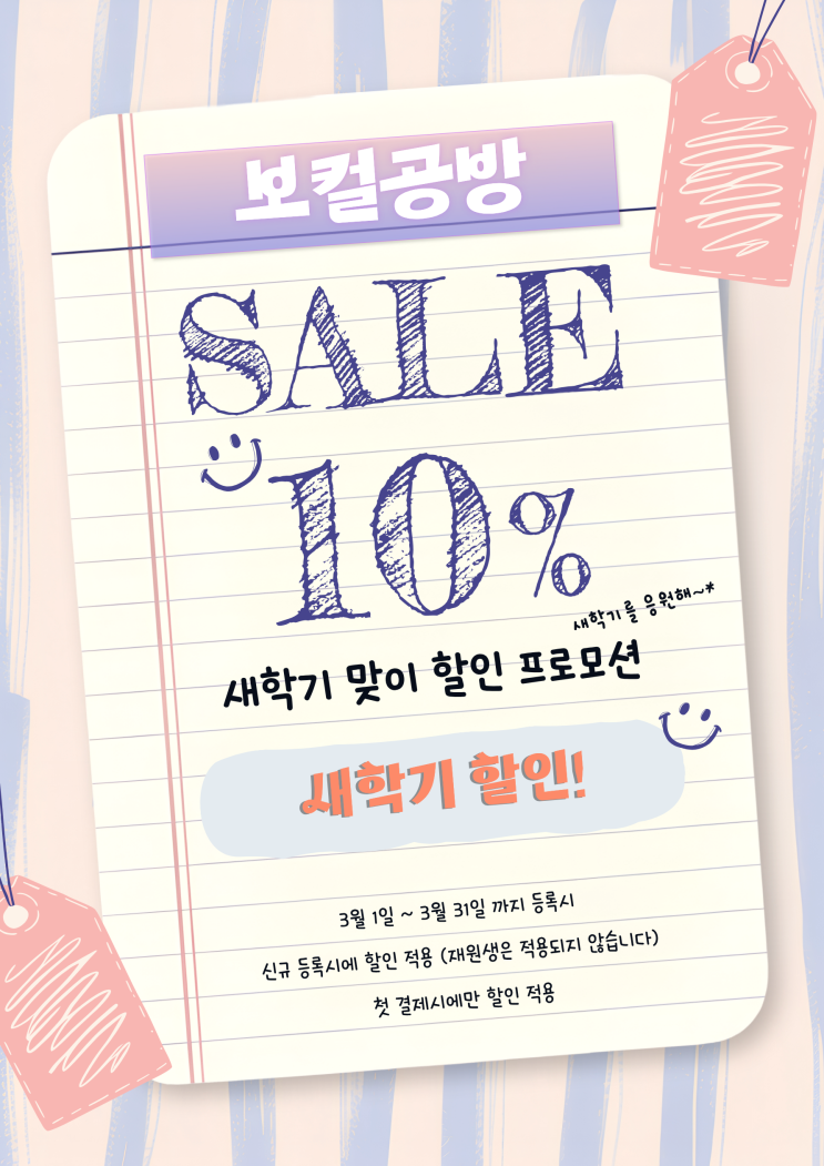 안녕하세요! 평택 고덕 실용음악학원 보컬공방 실용음악 학원입니다! "신학기 10% 할인 프로모션!" 오늘은 보컬공방에서 진행한 "할인 프로모션!" 에 대해 포스팅해 보겠습니다! 새봄이 오는 3월, 새 학기 맞이로 특별한 이벤트를 준비했습니다! 학생 여러분들을 위해 10% 할인 프로모션이 시작됩니다~! 3월 1일 ~ 3월 31일까지 등록 시 신규 등록 학생 대상 10% 할인! (아쉽게도 재원생은 적용되지 않습니다) 첫 결제 시에만 할인 적용됩니다! 전 과목에 적용 가능! (보컬, 피아노, 기타, 드럼, 작곡 등) 학원 등록 시 보컬, 기타, 피아노, 드럼 연습실은 학원 운영시간 내에는 자유롭게 이용 가능합니다! 새 학기 준비로 바....... <img src="https://blogthumb.pstatic.net/MjAyNjAzMTRfMTc1/MDAxNzczNDcwNjU5ODYz.M6z6utbT4ROyEmlGPPINRsBeltNHDcKXG1qZ8iQpK_Qg.EG8uC58akmzHBh5pTf3CblPRUaZIkLcpE_HmBiFJSYEg.PNG/3%BF%F9_%BD%C5%C7%D0%B1%E2_%C0%CC%BA%A5%C6%AE.PNG?type=s3" />