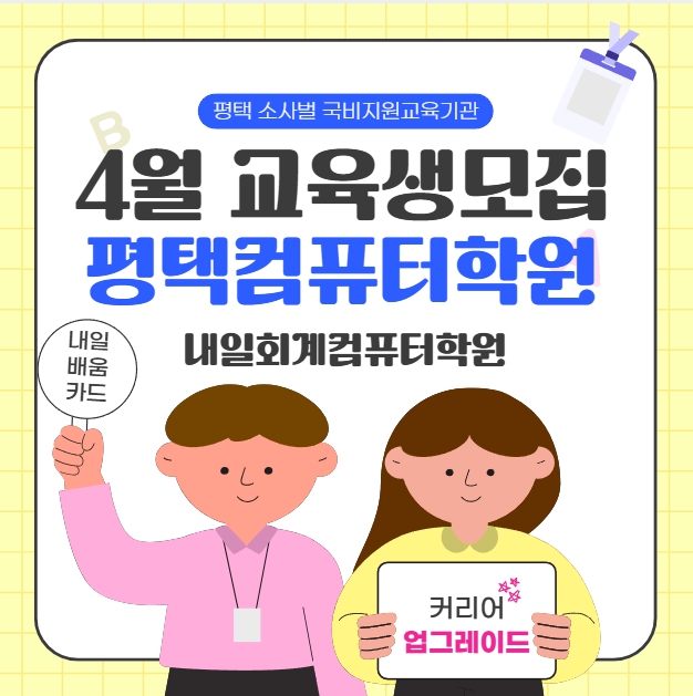 평택컴퓨터학원 4월교육일정안내합니다. (컴퓨터OA/전산회계자격증) 내일회계컴퓨터학원 평택컴퓨터 내일회계컴퓨터학원은 OA 한글, 엑셀, 파워포인트와 전산회계, 전산세무를 실무 중심 교육, 합격률 높은 자격증 취득 교육으로 취업활동에 보탬이 되는 직업훈련교육전문기관입니다. 내일배움카드를 이용한 국비지원교육과정 4월 교육생 모집을 실시합니다. OA 일반사무과정은 컴퓨터활용능력2급(필기+실기) 4월 6일 개강예정 4월 6일 - 4월 28일까지 오전반 수업입니다. ITQ엑셀 자격증 취득과정 4월 13일 개강예정 4월 13일 - 5월 8일까지 월수금 오후반 수업입니다. 5월 9일 시험대비반으로 운영합니다. 중장년과 프로그램 초심자를 위한 엑....... <img src="https://blogthumb.pstatic.net/MjAyNjAzMThfMTIy/MDAxNzczODA0ODU3MDA4.6CnrwoNAUdrpaMGLdXMCaOzHEKjZrMnVM_2VgRgPnUYg.ayoGHqnkXglA_FTlGywpcZfElnBQxrs2LsFjlU5aBHUg.JPEG/%C6%F2%C5%C3%C4%C4%C7%BB%C5%CD%C7%D0%BF%F8_4%BF%F9%B1%B3%C0%B0%BB%FD%B8%F0%C1%FD%C0%CF%C1%A4%C0%BB_%BE%CB%BE%C6%BA%B8%C0%DA.jpg?type=s3" />