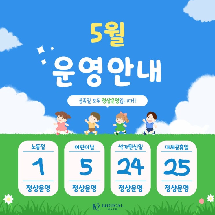 안녕하세요:-) 내신부터 수능까지 책임지는 로지컬 수학학원입니다! 벌써 녹음이 지는 5월이 성큼 다가왔습니다 가정의 달 5월은 공휴일이 많아 학원 운영 일정에 대해 궁금해하시는 분들이 많이 계셨습니다! 궁금증을 해소해드리고자 로지컬수학학원의 5월 학원 운영 일정에 대해 안내드리오니 참고하시어 학업 일정을 조율해보시면 좋을 듯 합니다:-) 로지컬수학학원 5월 학원 운영 안내 로지컬수학학원은 5/1(금) 노동절과 5/5(화) 어린이날, 5/24(일) 석가탄신일과 5/25(월) 대체공휴일 모두 휴무 없이 정상 운영합니다! 운영 일정은 케어링, 실전테스트, 로직테스트 모두 동일하게 적용되니 꼭 학원에 등원하시어 꾸준한 수학습관을 만....... <img src="https://blogthumb.pstatic.net/MjAyNjA0MjlfMTQy/MDAxNzc3NDYzMDMxNzIw.lI9SzuZHzF5e6wm6AfcURykcZv3WtN3hW3BJkXQ60ZEg.V5LTATZEtobbn6vbOiDMI6YIvPnKjXsy_CHvENn8Zp0g.JPEG/%C1%A6%B8%F1%C0%BB_%C0%D4%B7%C2%C7%D8%C1%D6%BC%BC%BF%E4..jpg?type=s3" />